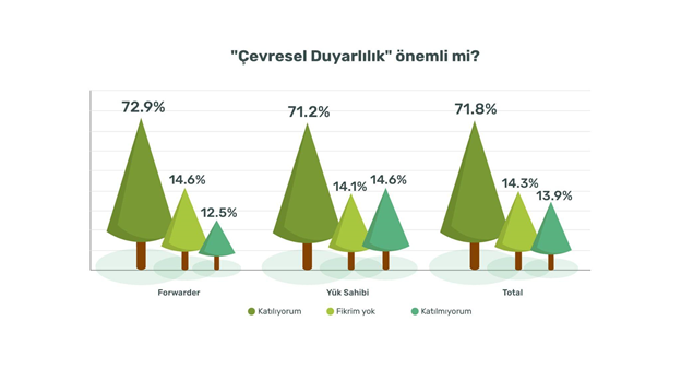 ShipsGo Academy, kullanıcıların çevresel duyarlılık hakkındaki farkındalığını ölçtüğünde elde edilen oranın oldukça yüksek (%71,8) olmasına rağmen, kullanıcılardan yalnızca %56,8'inin daha fazla navlun ödemeyi kabul ettiği sonucuna da ulaştı. Ayrıca ankete katılanların, kullanıcıların %62,9'unun “taşıyıcının çevreye duyarlılığı” varsa daha uzun taşıma sürelerini kabul ettiği gözlendi. Elde edilen verilere göre; iki grubu karşılaştırırken forwarderların her iki değişkende de daha fazla farkındalığa sahip olduğu anlaşıldı. Forwarder’ların bu tutumun, aynı sektörde (lojistik ve ulaşım) bulunmaları ve lojistik çevre gerçekleriyle kargo sahiplerinden daha sert yüzleşmeleri ile ilgisi olduğu ortaya konulabilir.