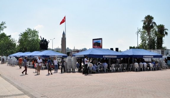 Gece geç saatlerde alanı dolduran vatandaşların bir çoğu meydanda beklemeye devam ediyor. Diğer taraftan Büyükşehir Belediyesi, meydanda toplanan vatandaşlar için dev ekran kurdu. Vatandaşlar yurt genelinde yaşanan son gelişmeleri, kurulan dev ekranda canlı olarak takip ediyor. Hava sıcaklığının 30 derece nem oranın yüzde 80’leri bulduğu şehir merkezinde vatandaşlar için çadırda da kuruldu. Öğle saatlerinin yaklaşması ile birlikte Büyükşehir Belediyesi tarafından vatandaşlara, çorba da ikram edildi.