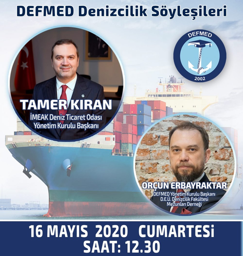İMEAK Deniz Ticaret Odası Yönetim Kurulu Başkanı Sn. Tamer KIRAN, 16 Mayıs 2020 Cumartesi günü Saat: 12:30'da DEFMED Denizcilik Söyleşilerine konuk olacaktır. Zoom üzerinden online olarak gerçekleştirilecek söyleşimize tüm mezunlarımızın katılımını bekliyoruz.