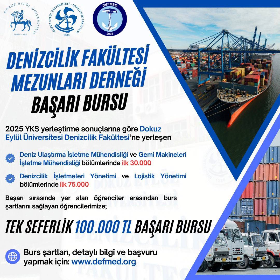 Denizcilik sektöründe nitelikli insan kaynağını artırmak amacıyla önemli çalışmalara imza atan Dokuz Eylül Üniversitesi Denizcilik Fakültesi Mezunları Derneği (DEFMED), 2025 YKS yerleştirme sonuçlarına göre Fakülteye yerleşen başarılı öğrencilere yönelik yeni bir burs programı başlattı.
