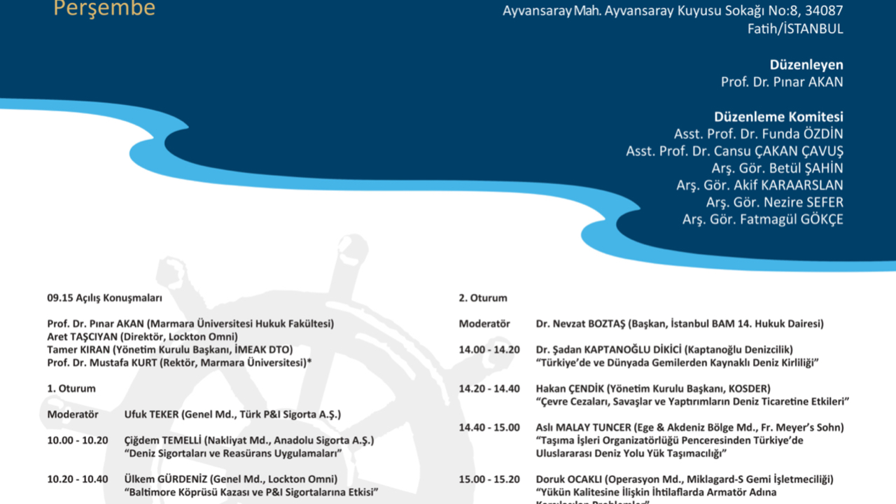 Açılış konuşmalarını Marmara Üniversitesi Hukuk Fakültesi’nden Prof. Dr. Pınar Akan, Lockton Omni Direktörü Aret Taşcıyan, İMEAK Deniz Ticaret Odası Yönetim Kurulu Başkanı Tamer Kıran ve Marmara Üniversitesi Rektörü Prof. Dr. Mustafa Kurt’un yapacağı sempozyumda, düzenlenecek 3 oturumda alanında uzman isimler konuşmacı olarak yer alacak.