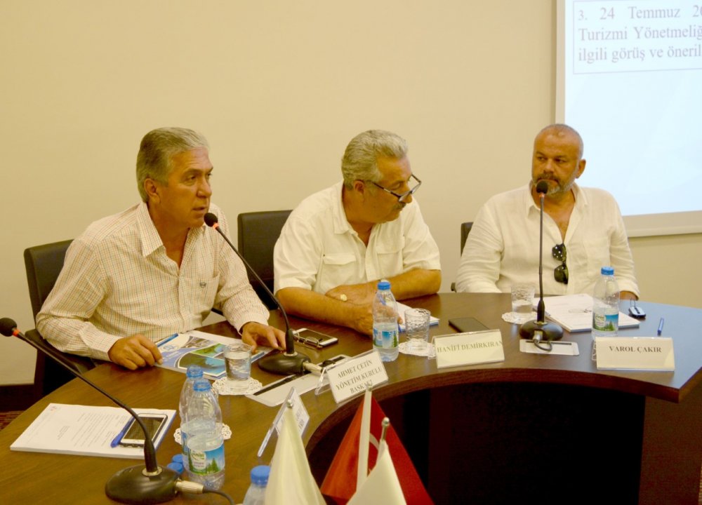 Toplantıda, 24 Temmuz 2009 tarihinde yayımlanan Deniz Turizmi Yönetmeliğinde yapılacak olan revizyonlar ile ilgili görüş ve öneriler de alındı. Başkan Ahmet Çetin, konunun önemine dikkat çekerek, “Deniz turizmini; Kurvaziyer turizm, Marina İşletmeciliği, Yat İşletmeciliği, Günübirlik Tur İşletmeciliği, Bareboat İşletmeciliği, Su Sporları ve Su altı Sporları İşletmeciliği kapsamaktadır. Odamız üyelerinin büyük çoğunluğu ekmeğini deniz turizminden kazanmaktadır. 24 Temmuz 2009 tarihinde yayımlanan Deniz Turizmi Yönetmeliğinde revizyon yapılacak. Bu konuda tüm üyelerimizin görüş ve önerilerine ihtiyacımız var. Tüm üyelerimiz ve konu ile ilgili paydaşlarımız 15 Ağustos 2018 tarihine kadar Odamıza gereken öneri ve taleplerini iletebilirler. Bunun için bu yönetmelik çok önemlidir” dedi.