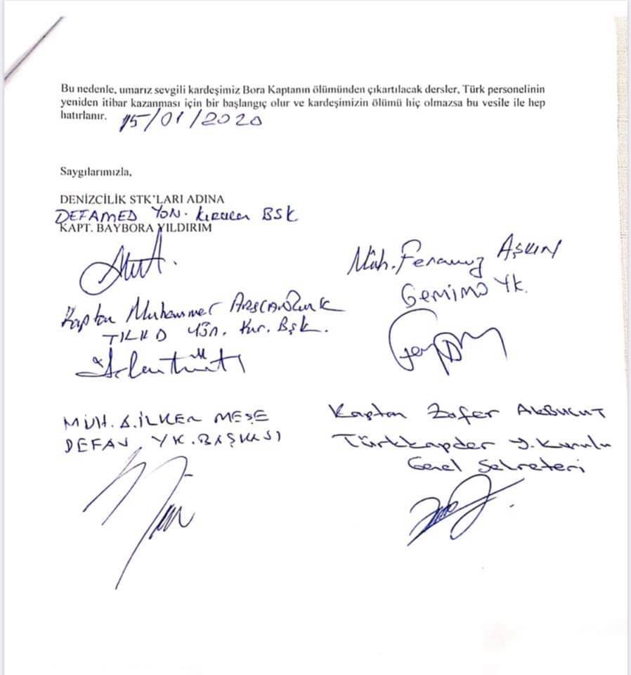 Gemi Makineleri İşletme Mühendisleri Odası (GEMİMO), İTÜ Denizcilik Fakültesi Mezunları Sosyal Yardım Vakfı (DEFAV), İTÜ Denizcilik Fakültesi Mezunları Derneği (DEFAMED), Türk Uzakyol Gemi Kaptanları Derneği (TÜRKAPDER) ve Türk Kılavuz Kaptanlar Derneği (TKKD) tarafından yapılan basın bildirisi ile sağlıklı bir Türk denizciliğinin yol haritası çizildi. Ailenin Avukatı Çağlar Coşkunsu'nun da hazır bulunduğu ve Türkiye Denizcilik Federasyonu’nun da (TÜRDEF) 20 STK ve 5 onursal üyesi ile destek verdiği açıklamada devletten, armatörlerden ve donatanlardan beklentiler açıklandı.