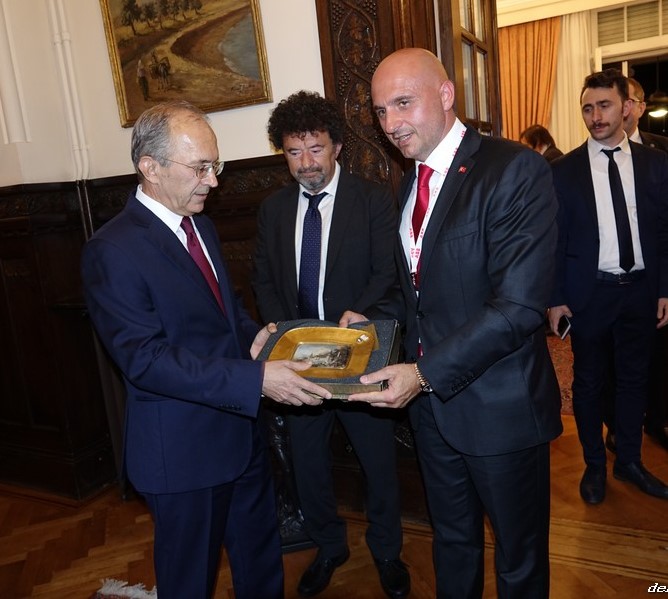 Yemek sonunda GİSBİR Başkanı Murat Kıran, Atina Büyükelçisi Yaşar Halit Çevik'e bir anı objesi takdim etti.