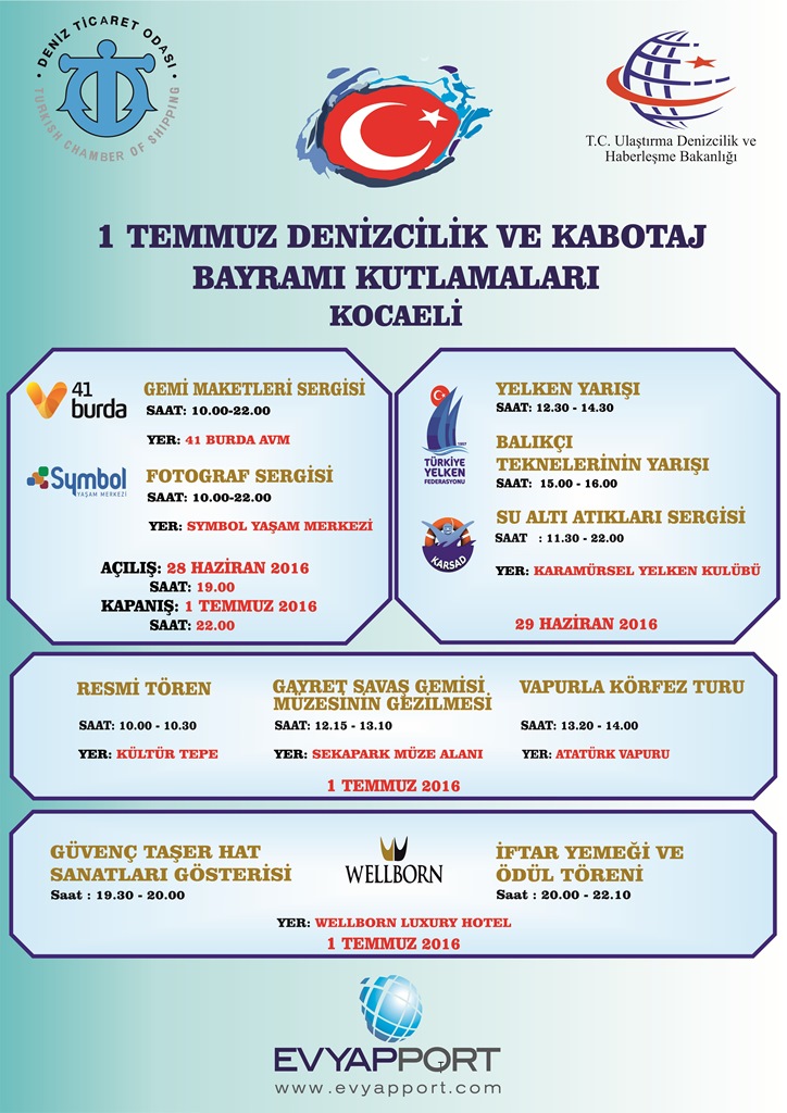 Bu yıl 90.sı kutlanacak olan 1 Temmuz Denizcilik ve Kabotaj Bayramı; etkinlikler, yarışmalar ve sergilerle kutlanacak. Ulaştırma Denizcilik ve Haberleşme Bakanlığı Kocaeli Liman Başkanlığı ve Deniz Ticaret Odası Kocaeli Temsilciliği tarafından organize edilen Denizcilik ve Kabotaj Bayramı Kutlamalarına Körfez’de bulunan EVYAPPORT Limanı ana sponsor olarak destek verecek.