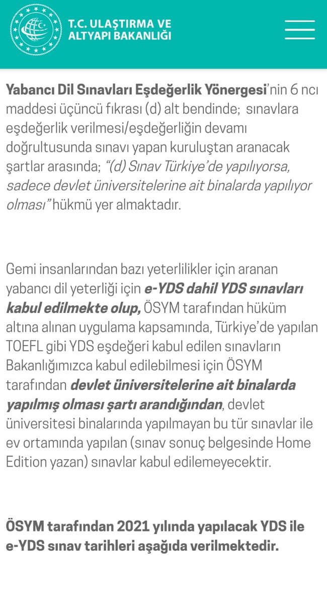 Ulaştırma ve Altyapı Bakanlığı Denizcilik Genel Müdürlüğü, zabitan sınıfı gemi insanı yeterlikleri için istenen İngilizce dil puanı şartı için e-YDS kabul edildiğini açıkladı.