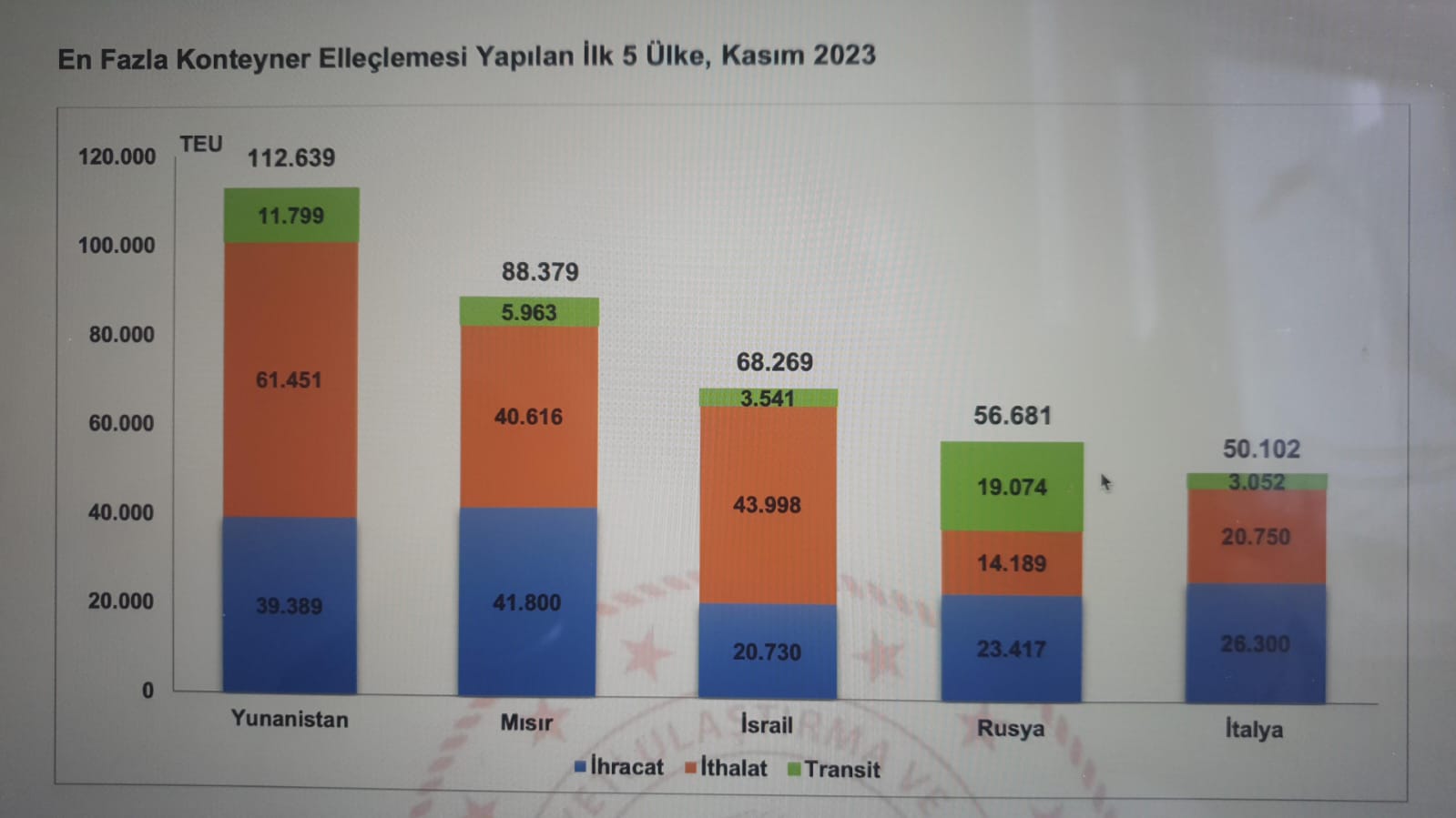 Yunanistan, 2023 yılı Kasım ayında 112 bin 639 TEU ile en fazla konteyner elleçlemesi yapılan ülke oldu. Yunanistan’ı sırasıyla 88 bin 379 TEU ile Mısır ile yapılan taşımalar ve 68 bin 269 TEU ile İsrail ile yapılan taşımalar takip etti.