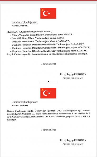 Ulaştırma ve Altyapı Bakanlığı Avrupa Birliği ve Dış İlişkiler Genel Müdürü Erdem Direkler görevden alınarak yerine Denizcilik Genel Müdür Yardımcısı Burak Aykan atandı. Ulaştırma ve Altyapı Bakanlığı Altyapı Yatırımları Genel Müdür Yardımcılığına Enver Mamur, Denizcilik Genel Müdür Yardımcılığına Yılmaz Taşcı ve Mustafa Çankaya, Ulaştırma Hizmetleri Düzenleme Genel Müdür Yardımcılığına Feriha Mert, Haydar Ufuk Kale ve Murat Korçak atandı.