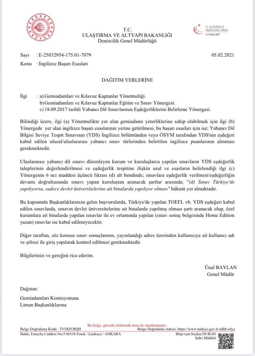 Ulaştırma ve Altyapı Bakanlığı Denizcilik Genel Müdürlüğü, özel kurumlar ve online yapılan YDS sonuçlarının kabul edilmeyeceğini duyurdu.