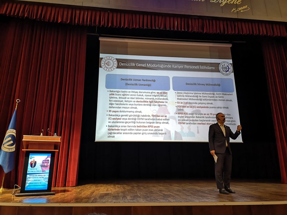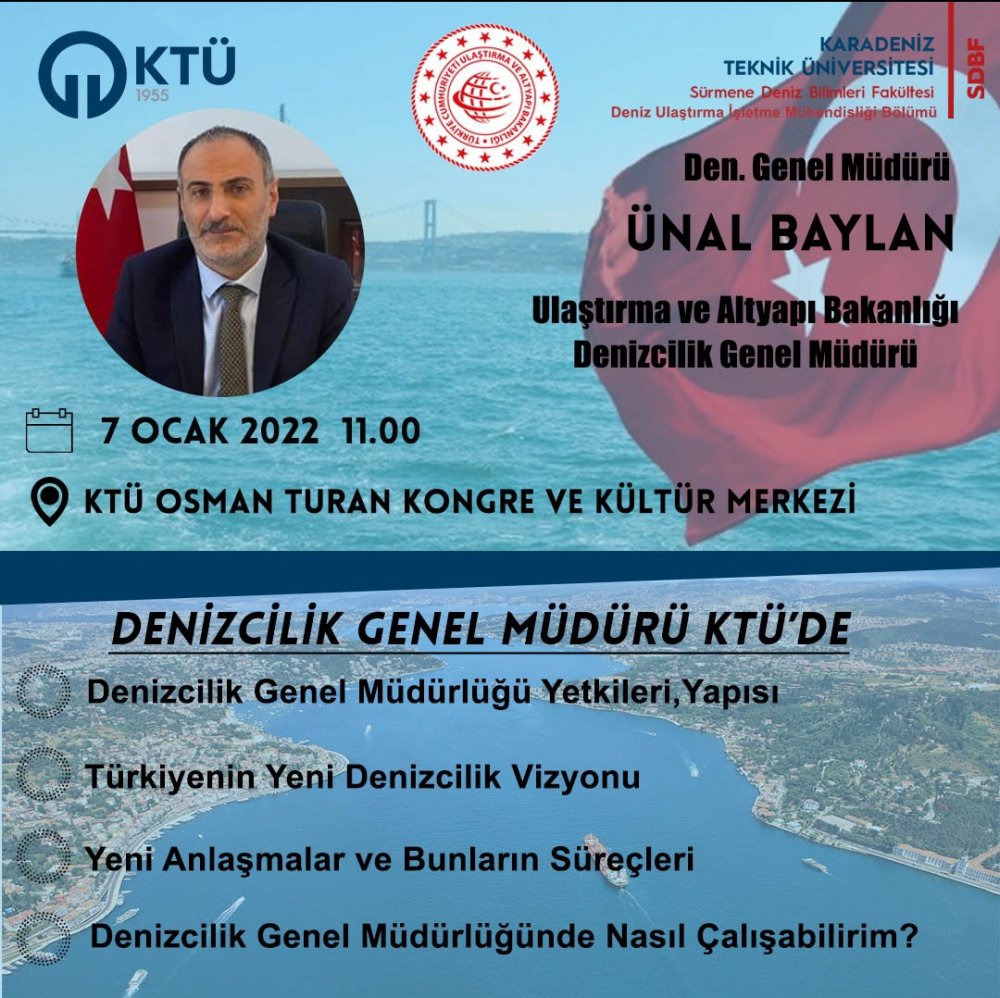 16. Geleneksel Kariyer Günleri kapsamında Denizcilik sektörünün öğrencilerle bir araya geldiği etkinlikte Denizcilik Genel Müdürü Ünal BAYLAN KTÜ DUİM öğrencilerinin konuğu oldu. KTÜ Rektörü Prof.Dr. Hamdullah ÇUVALCI, Sürmene Deniz Bilimleri Fakültesi Dekanı Prof. Dr. Ali Muzaffer FEYZİOĞLU, fakülte ve bölüm öğretim üyeleri, Karadeniz bölgesi liman başkanları ve öğrencilerin yoğun katılımı ile gerçekleşen konferansta Sn. Baylan öğrencilerin geleceğe dönük planlamalarına ışık tutacak nitelikte tavsiyelerde bulundu.