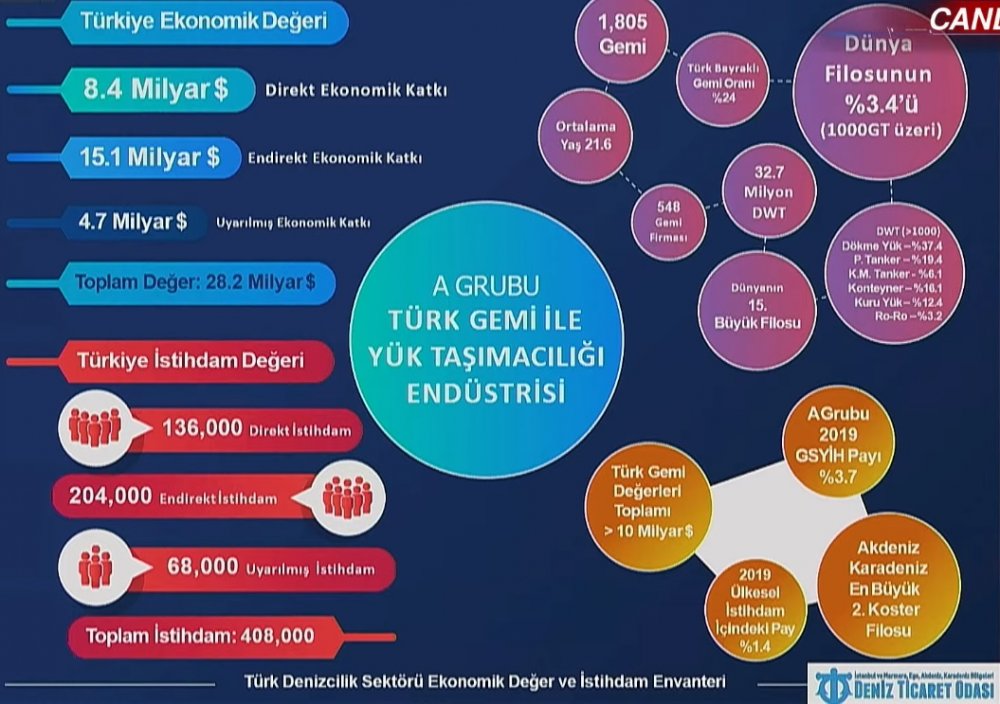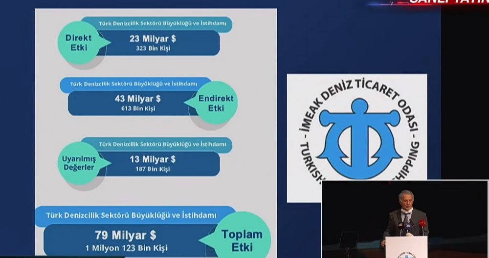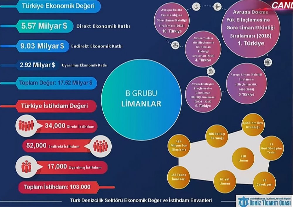 Genel olarak, ülkemiz denizcilik sektörü direkt etki olarak 23 milyar dolar katkı ve 232 bin kişilik istihdam sağlarken, direkt, endirekt ve uyarılmış olarak toplamda yaklaşık 79 milyar dolar ekonomik katkı ile 1 milyon 123 kişilik istihdam yaratmakta olduğu belirtildi.
