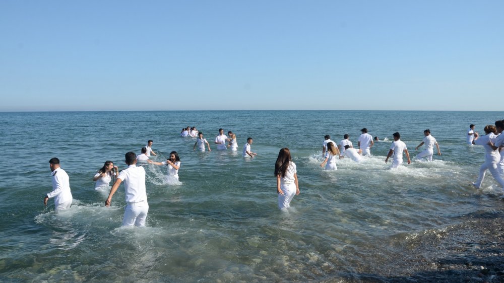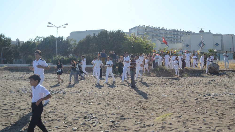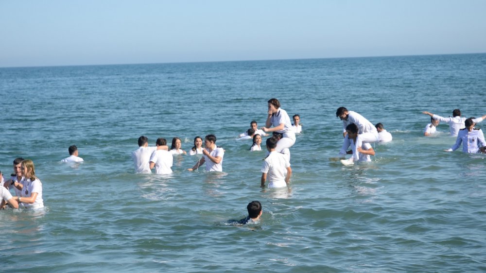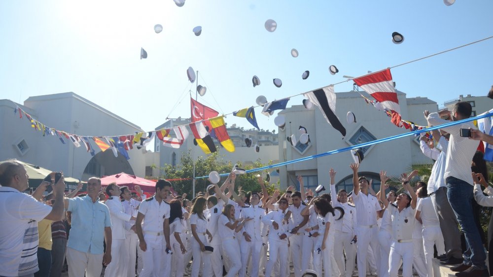 Mezuniyet töreninin sonunda şapkalarını havaya fırlatarak mezun olmanın sevincini yaşayan öğrenciler, her yıl geleneksel olarak yaptıkları gibi bu yıl da mezuniyet sevincini üniforma ile denize girerek sürdürdü.
