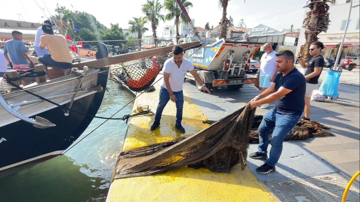 Bodrum’da son süngerci "Aksona Mehmet" lakaplı Mehmet Baş ile beraberindeki denizciler, deniz dibinden yaklaşık 500 metrekare büyüklüğünde hayalet ağ çıkardı.