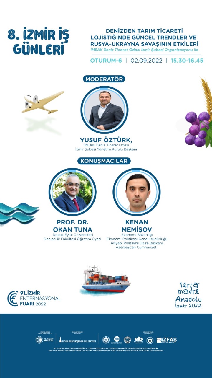 Oturum başkanlığını İMEAK Deniz Ticaret Odası İzmir Şubesi Yönetim Kurulu Başkanı Yusuf Öztürk’ün yapacağı toplantının konuşmacıları Dokuz Eylül Üniversitesi Denizcilik Fakültesi Öğretim Üyesi Prof.Dr. Okan Tuna ve Azerbaycan Cumhuriyeti Ekonomi Bakanlığı Ekonomi Politikası Genel Müdürlüğü Altyapı Politikası Daire Başkanı Kenan Memişov olacaktır.