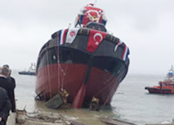 Zonguldak'ın Ereğli ilçesinde, Hollandalı firma için yapılan 2 milyon avro değerindeki römorkör, denize indirilmesi sırasında karaya oturdu.