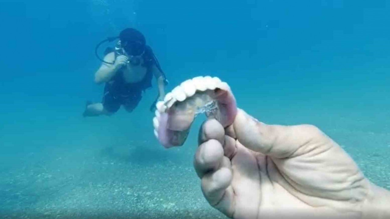 Antalya’nın su altında araştırma ve inceleme dalışları yapan Akdeniz Üniversitesi Öğretim Üyesi Prof. Dr. Mehmet Gökoğlu, üst çene protez diş takımı buldu. O anlar su altı kamerasına yansırken Gökoğlu, protez diş yaptırmanın maliyetli olduğuna dikkat çekerek sahibinin bulunması çağrısı yaptı, dişlerini düşürenler ise soluğu onun yanında aldı.