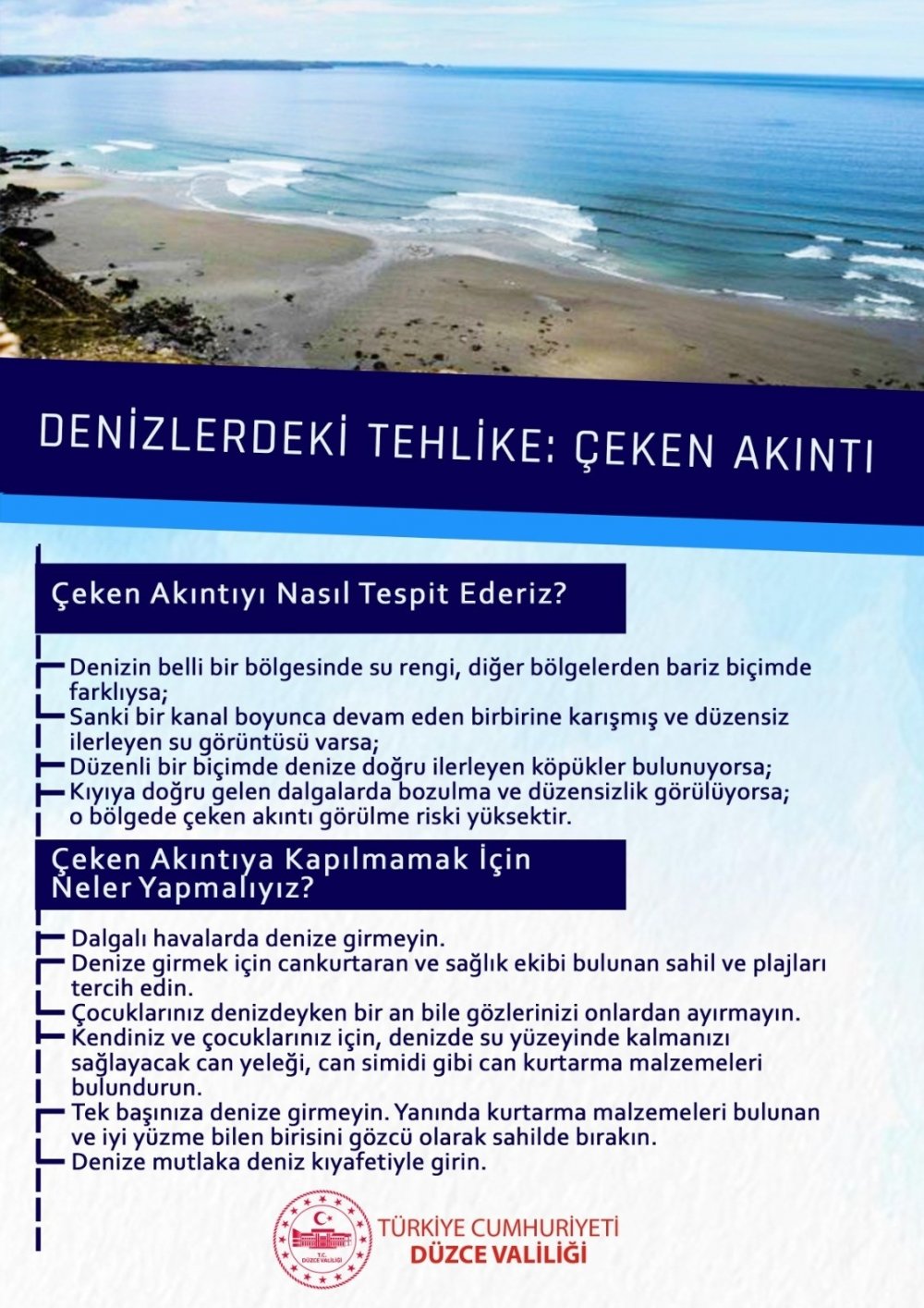 Bu nedenle Düzce Valiliği de vatandaşları uyardı. Yapılan uyarıda; "Çeken akıntıyı nasıl tespit ederiz? Denizin belli bir bölgesinde su rengi, diğer bölgelerden bariz bir biçimde farklıysa, sanki bir kanal boyunca devam eden birbirine karışmış ve düzensiz ilerleyen su görüntüsü varsa, düzenli bir biçimde denize doğru ilerleyen köpükler bulunuyorsa, kıyıya doğru gelen dalgalarda bozulma ve düzensizlik görünüyorsa o bölgede çeken akıntı görülme riski yüksektir. Çeken akıntıya kapılmamak için; Dalgalı havalarda denize girmeyin. Denize girmek için cankurtaran ve sağlık ekibi bulunan sahil ve plajları tercih edin. Çocuklarınız denizdeyken bir an bile gözlerinizi onlardan ayırmayın. Kendiniz ve çocuklarınız için, denizde su yüzeyinde kalmanızı sağlayacak can yeleği, can simidi gibi can kurtarma malzemeleri bulundurun. Tek başınıza denize girmeyin. Yanında kurtarma malzemeleri bulunan ve iyi yüzme bilen birisi gözcü olarak sahilde bırakın. Denize mutlaka deniz kıyafeti ile girin."