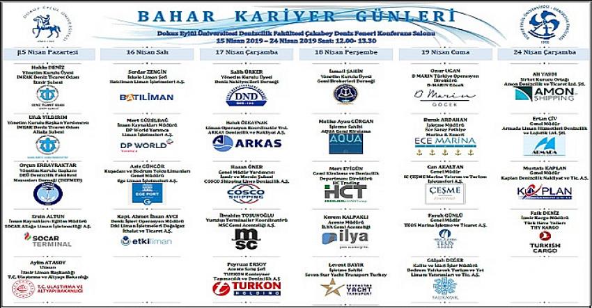 Dokuz Eylül Üniversitesi (DEÜ) Denizcilik Fakültesi Denizcilik Kulübü’nün Düzenlediği “2019 Bahar Kariyer Günleri” 15 Nisan 2019 Pazartesi günü Denizcilik Fakültesi Çakabey Deniz Feneri Konferans Salonu’nda başlıyor. DEÜ Denizcilik Fakültesi bünyesinde düzenlenen “2019 Bahar Kariyer Günleri”ne denizcilik ve lojistik kuruluşlarının temsilcilerinden oluşan 28 konuşmacının katılması bekleniyor.