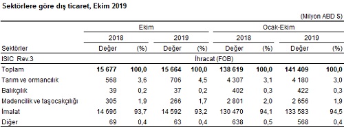 Türkiye İstatistik Kurumu ile Ticaret Bakanlığı işbirliğiyle oluşturulan geçici dış ticaret verilerine göre; ihracat 2019 yılı Ekim ayında, 2018 yılının aynı ayına göre yüzde 0,1 azalarak 15 milyar 664 milyon dolar, ithalat yüzde 8 artarak 17 milyar 472 milyon dolar olarak gerçekleşti.