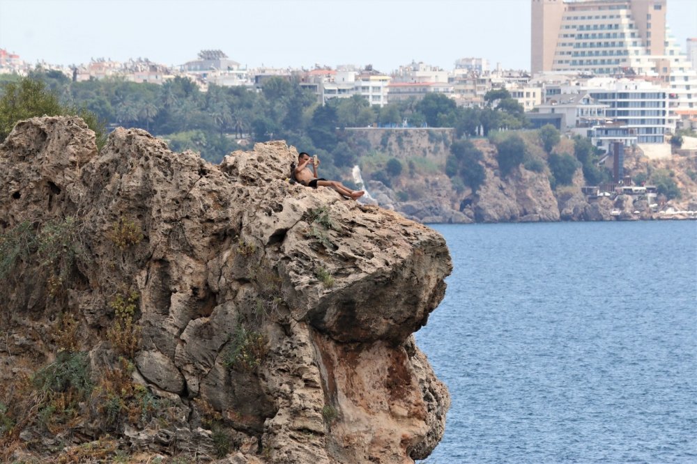Antalya'nın dünyaca ünlü Konyaatlı Sahili'nde bulunan falezlere denizden iple tırmanan gençlerin zaman zaman ellerini bırakarak oynaması ve balıklama denize atlaması izleyenlerin yüreklerini ağızlarına getirdi. Bir başka genç ise 30 metre yükseklikteki falezin hemen ucunda güneşlendi.