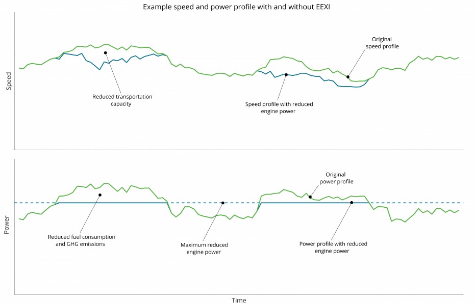 Bu yılın Haziran ayında kabul edilen ve 1 Ocak 2023'te yürürlüğe girmesi planlanan EEXI, deniz taşımacılığı hizmeti başına CO2 emisyonlarını geminin tasarım özelliklerine göre değerlendiricek ve kısıtlayacak. EEXI'ye uyum sağlamanın en yaygın yöntemlerinden biri ise motor gücünü sınırlamak olacak.