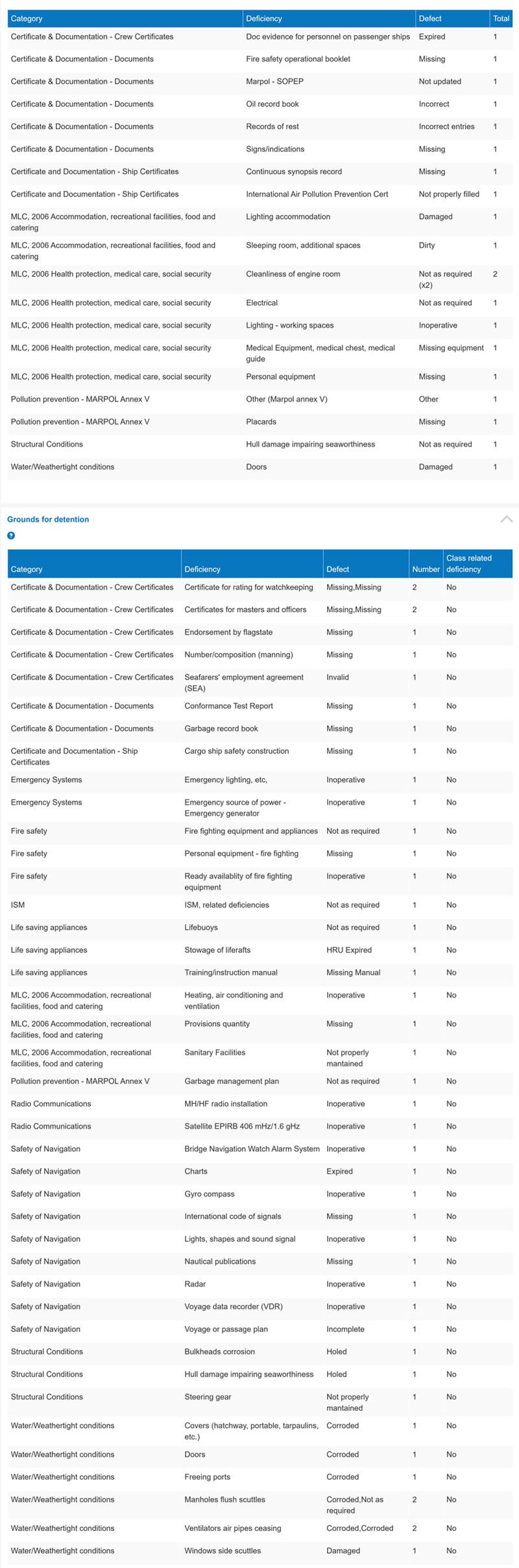 Tulcea'daki yetkililer, gemi zabitlerinin eksik sertifikaları, MARPOL düzensizlikleri, bozuk bir acil durum jeneratörü, eksik yangın söndürme teçhizatı, çalışmayan bir EPIRB, süresi dolmuş haritalar, bozuk bir HF telsiz, dahil olmak üzere geminin her yerinde hatalar buldu. Ayrıca aşınmış ambar kapaklarını ve hasarlı lumbuzları raporladılar.