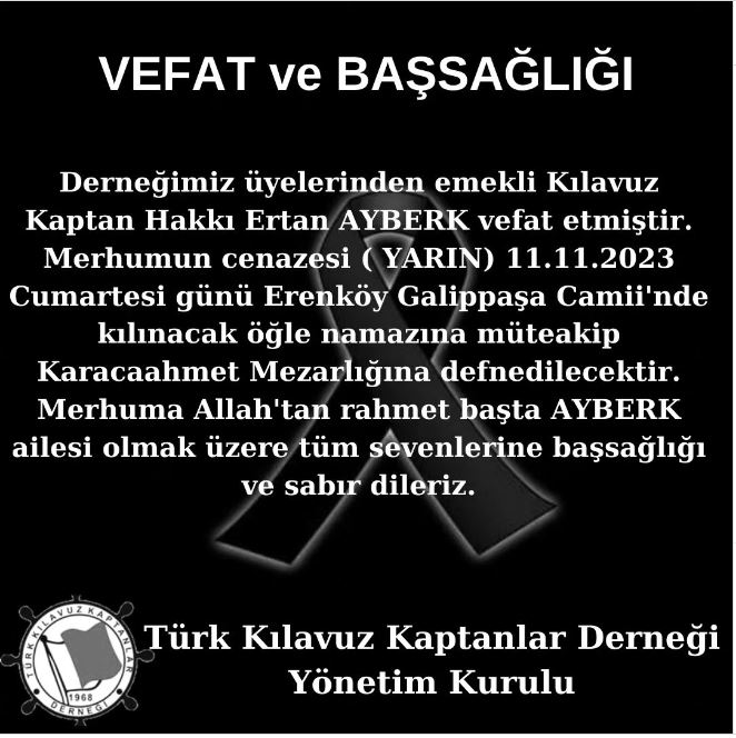 Kapt. Hakkı Ertan Ayberk’in cenazesi 11 Kasım 2023, Cumartesi günü Erenköy Galippaşa Camisi’nden öğle vakti kaldırılacak ve Karacaahmet Mezarlığı’na defnedilecek.