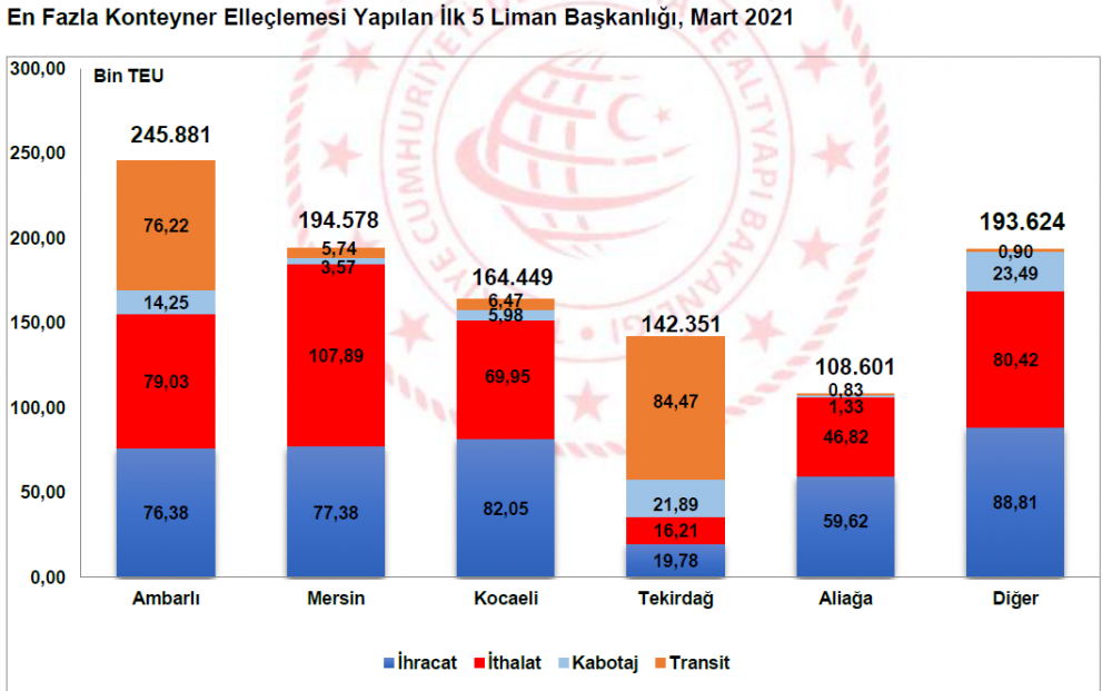 2021 yılı Mart ayında Ambarlı Liman Başkanlığı idari sınırlarında faaliyet gösteren liman tesislerinde toplam 245 bin 881 TEU konteyner elleçlemesi gerçekleşti. Bu liman tesislerinde elleçlenen konteynerlerin 155 bin 411 TEU’sunu (%63,2’sini) dış ticarete konu konteynerler, 76 bin 220 TEU’sunu (%31’ini) transit konteynerler ve 14 bin 250 TEU’sunu da (%5,8’ini) kabotajda taşınan konteynerler oluşturmaktadır. Ambarlı Liman Başkanlığını 194 bin 578 TEU ile Mersin Liman Başkanlığı ve 164 bin 449 TEU ile Kocaeli Liman Başkanlığı takip etti. 2021 Mart ayında 15 liman başkanlığının idari sınırlarında faaliyet gösteren liman tesislerinde konteyner elleçlemesi gerçekleşti. En fazla konteyner elleçlemesi gerçekleşen ilk 5 liman başkanlığında toplam 855 bin 859 TEU konteyner elleçlenmiş olup Türkiye limanlarında elleçlenen toplam konteynerlerin %81,6’sını oluşturmakta.