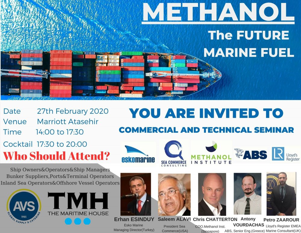Eskomarine, Sea Commerce Consulting , Methanol İnstitute Singapore , ABS ve Lloyd’s Register’ın da katkılarıyla 27 Şubat 2020 tarihinde Marriott Ataşehir otelinde Methanol – Geleceğin Deniz Yakıtı konulu bir seminer duzenliyor.