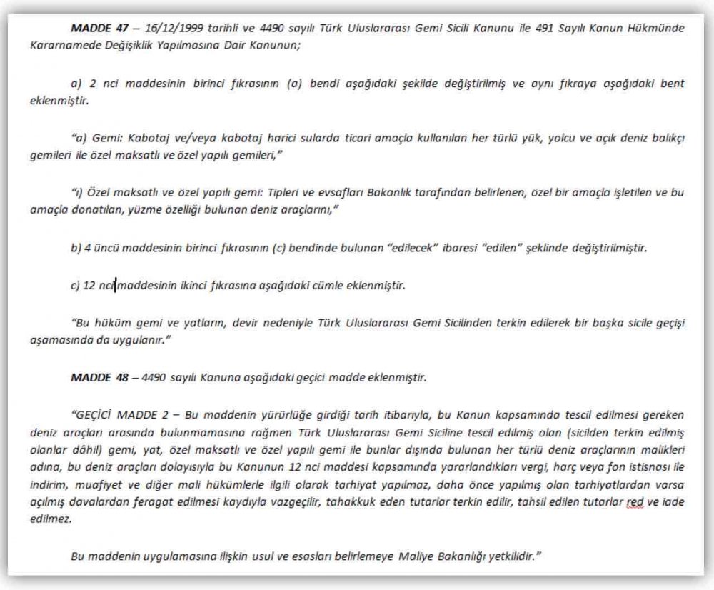 Bu Kanun’un denizcilik sektörü açısından önemi ise; 4490 sayılı Türk Uluslararası Gemi Sicili Kanunu ile 491 Sayılı Kanun Hükmünde Kararnamede Değişiklik Yapılmasına Dair Kanunda bazı değişiklikleri içeren 47. ve 48. maddeleridir.
