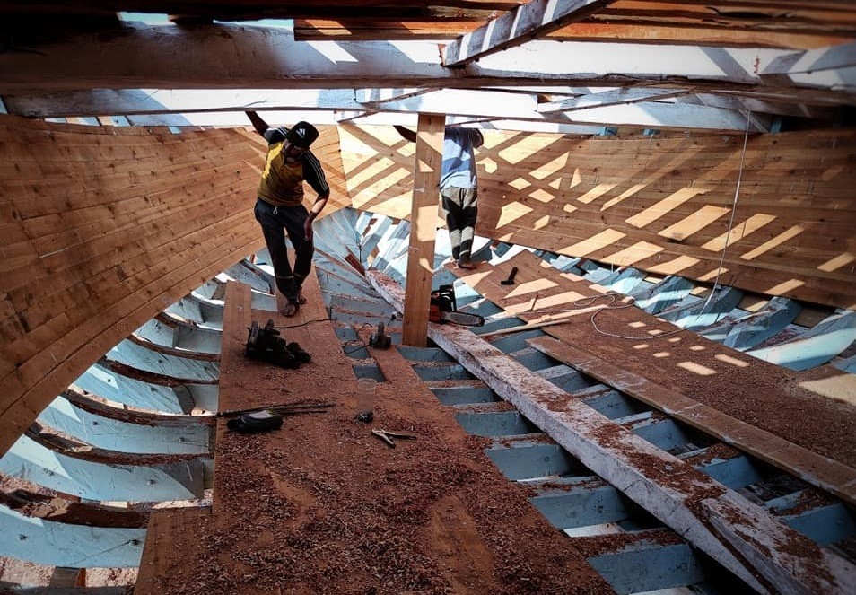 Filistin'in Gazze Şeridi'nde İsrail'in uyguladığı ablukaya rağmen en büyük balıkçı teknesinin yapım çalışmaları sürüyor.