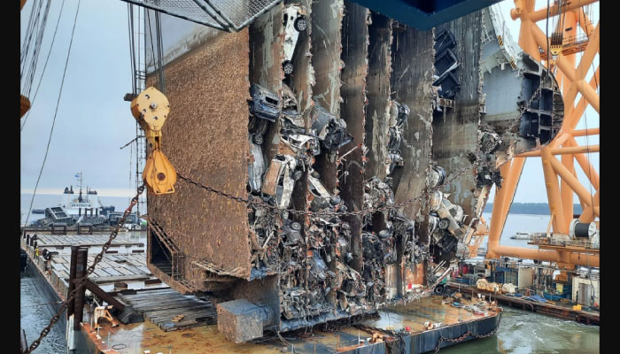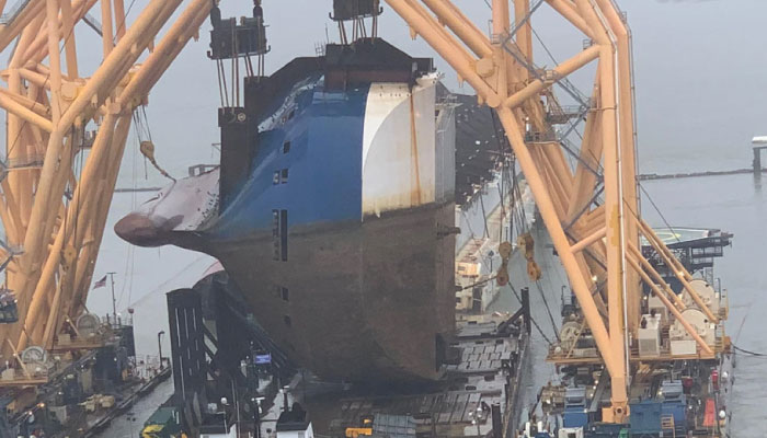 Haftalar süren çalışmadan sonra Ro/ Ro gemisi Golden Ray'in enkazının sekiz bölümünden ilkinin sudan çıkarıldığı bildirildi. Geminin baş bölümü cumartesi sabahı tamamen kesildi ve sudan çıkarılarak bir mavnaya yerleştirildi.