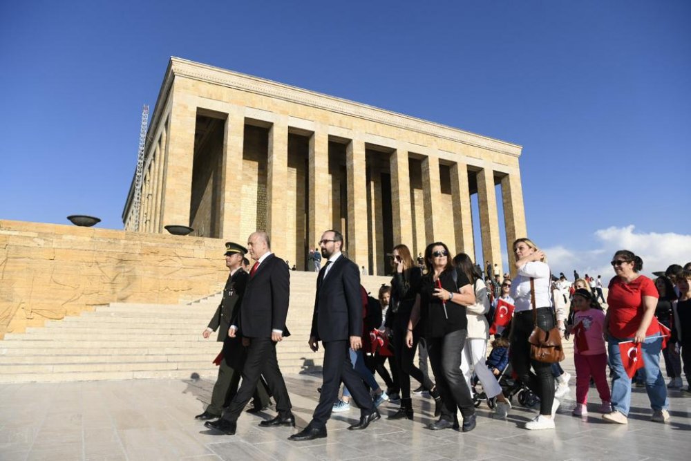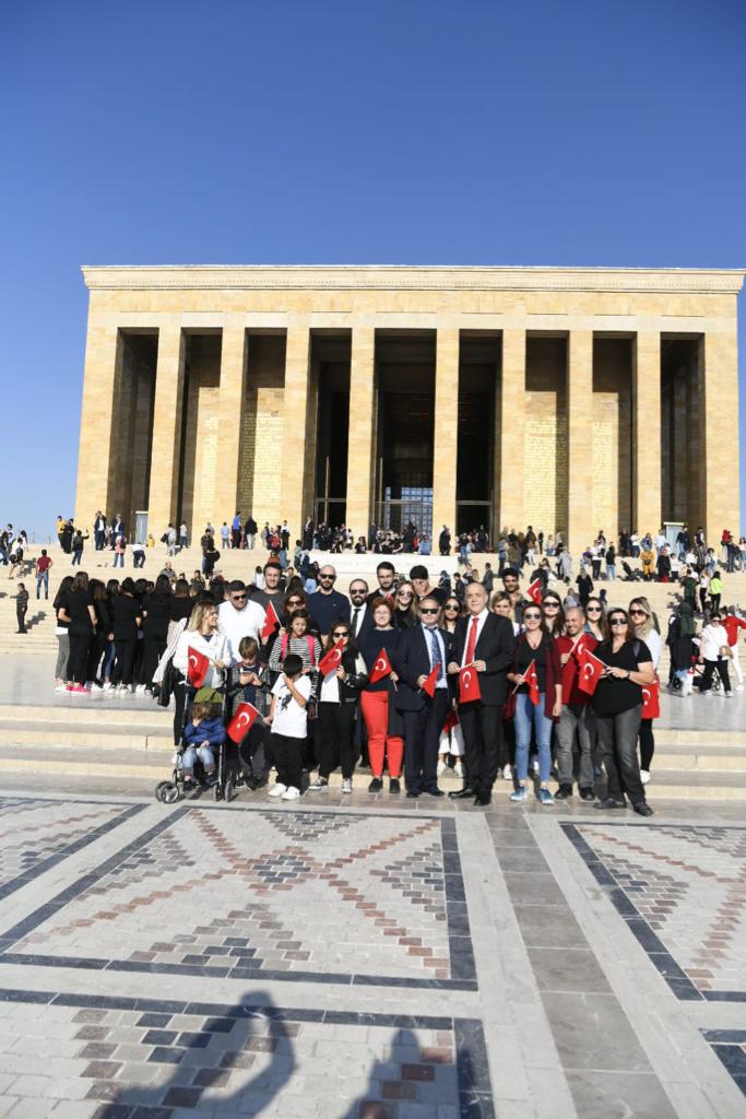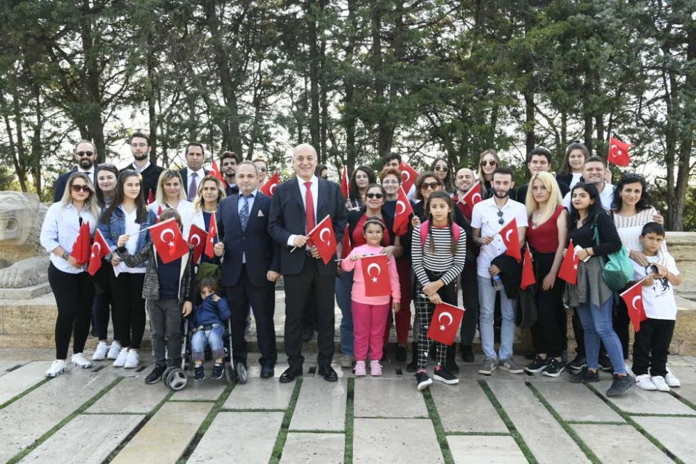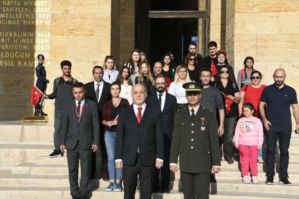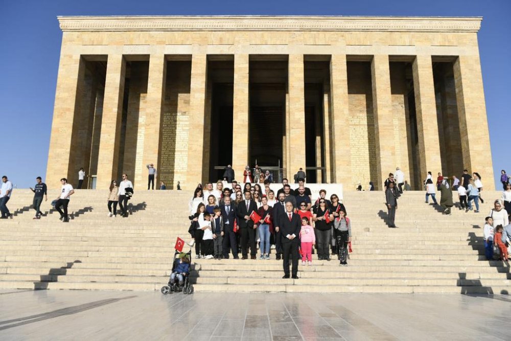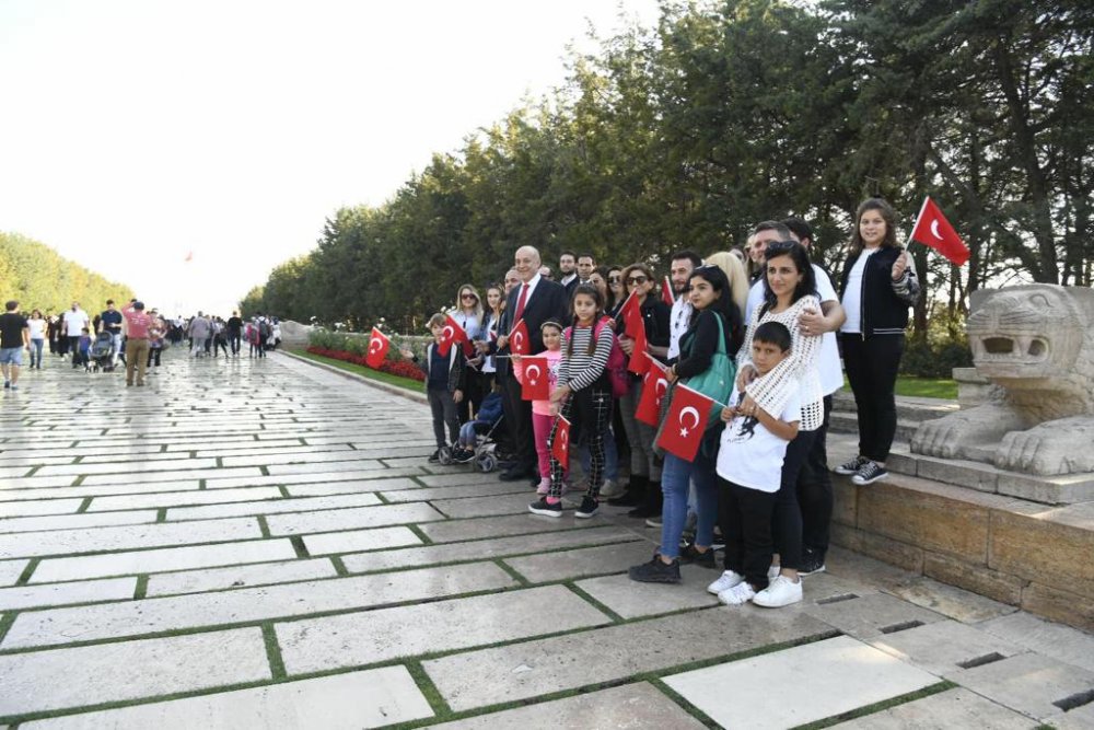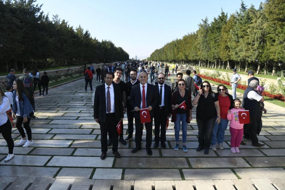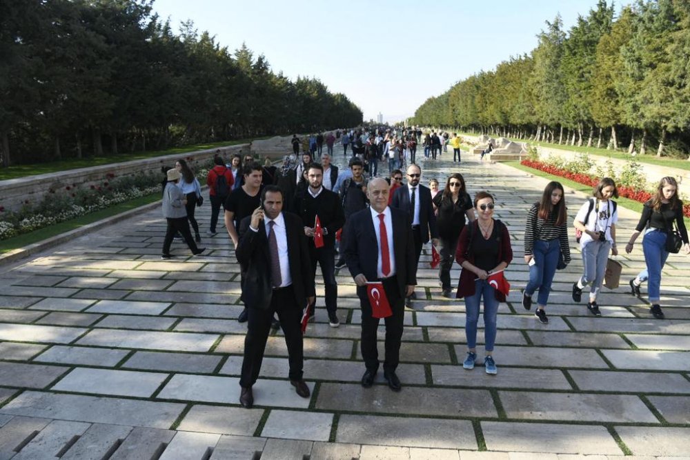Aslanlı Yol’da yürüyen heyet, mozoleye gelerek çelenk bıraktı.