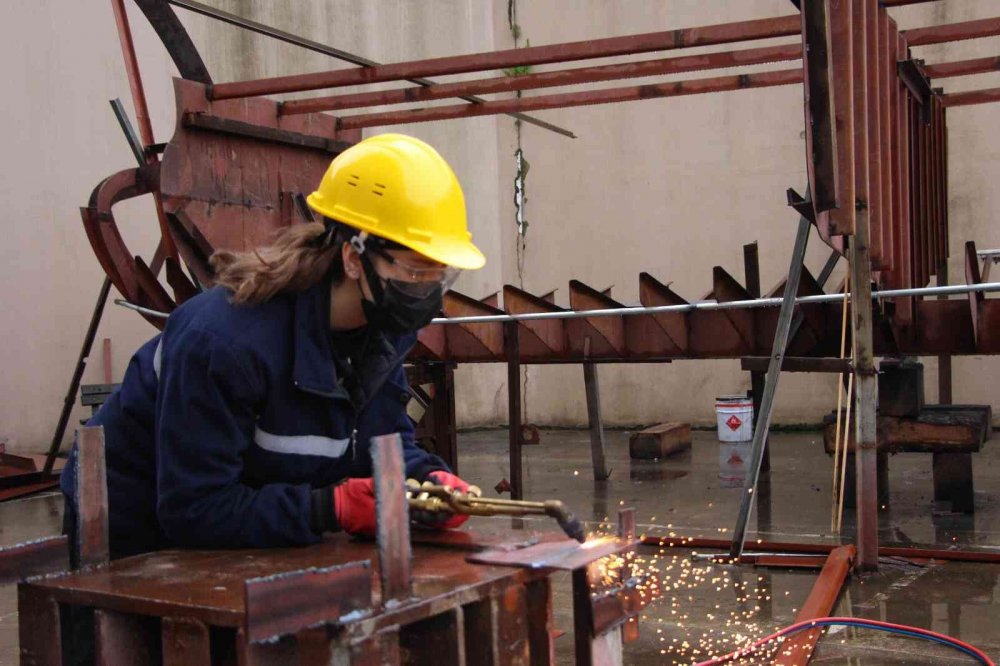 Karadeniz Teknik Üniversitesi (KTÜ) Abdullah Kanca Meslek Yüksek Okulu Gemi İnşaatı Programı'nda öğrenim gören 4 kız öğrenci eğitim aldıkları Sürmene Tersanesi'nde kaynakçı ustalarına adeta taş çıkartıyor.
