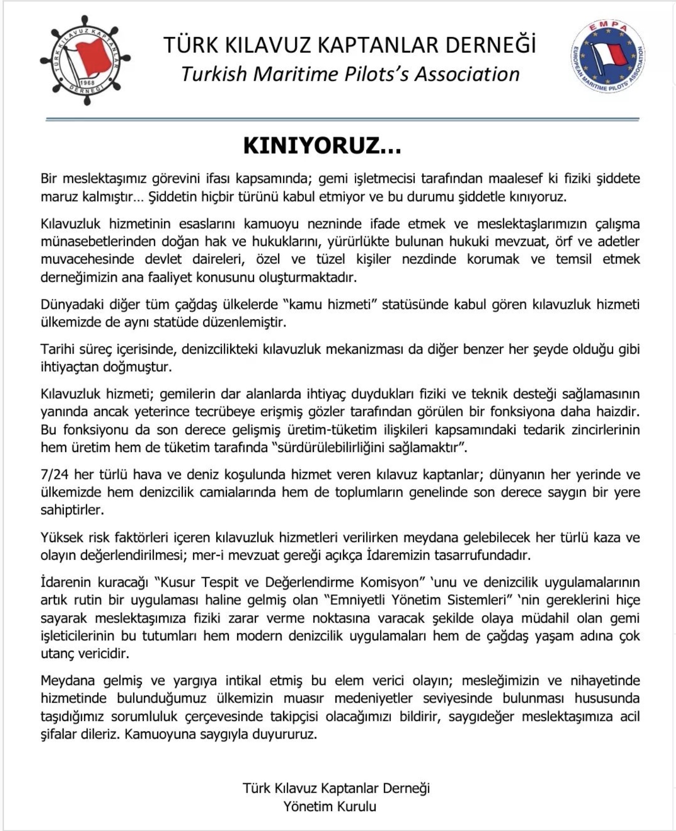 Türk Kılavuz Kaptanlar Derneği, darp olayına ilişkin kınama yayınladı.