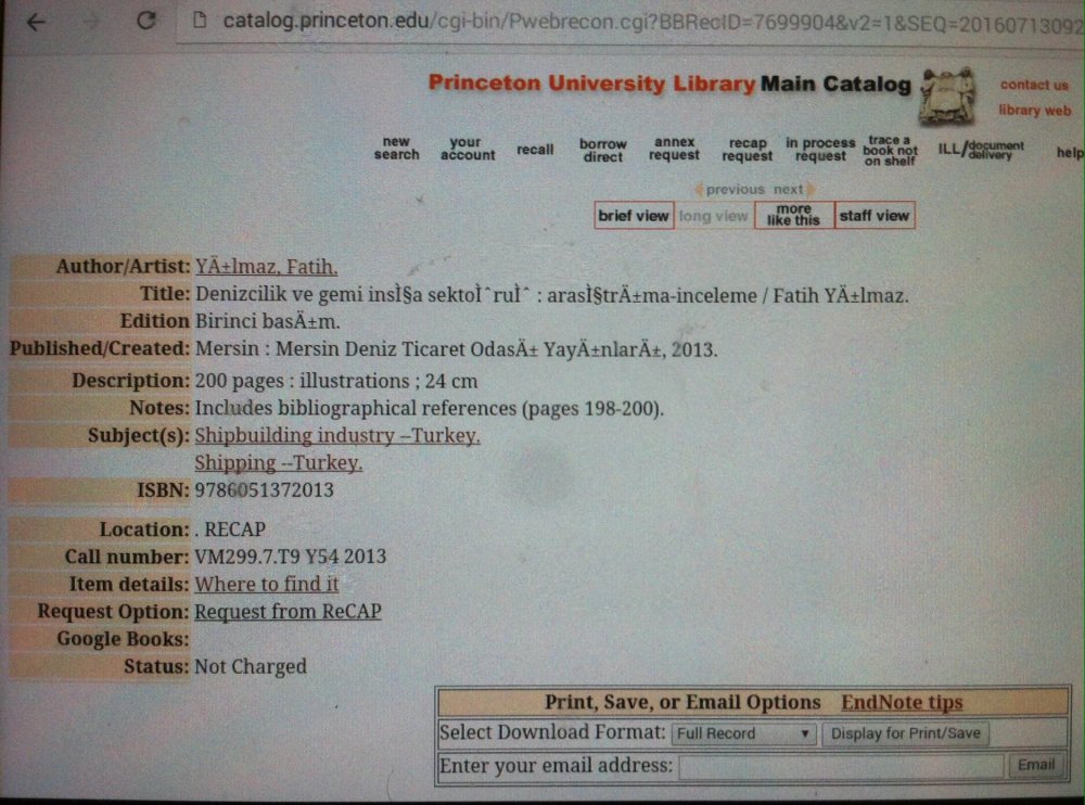 Princeton Üniversitesi kütüphanesinin web sitesine (http://catalog.princeton.edu/cgi-bin/Pwebrecon.cgi?BBID=7699904) göre, Üniversite kütüphanesinin ana kataloğuna "V-Naval Sience, VM - Naval Architecture, Marine Engineering" kategorisi altında "VM299.7.T9 Y54 2013" arama numarası ile kaydedilen kitabın konusunun "Shipbuilding Industry & Shipping - Turkey" olarak belirtildiği görülüyor.