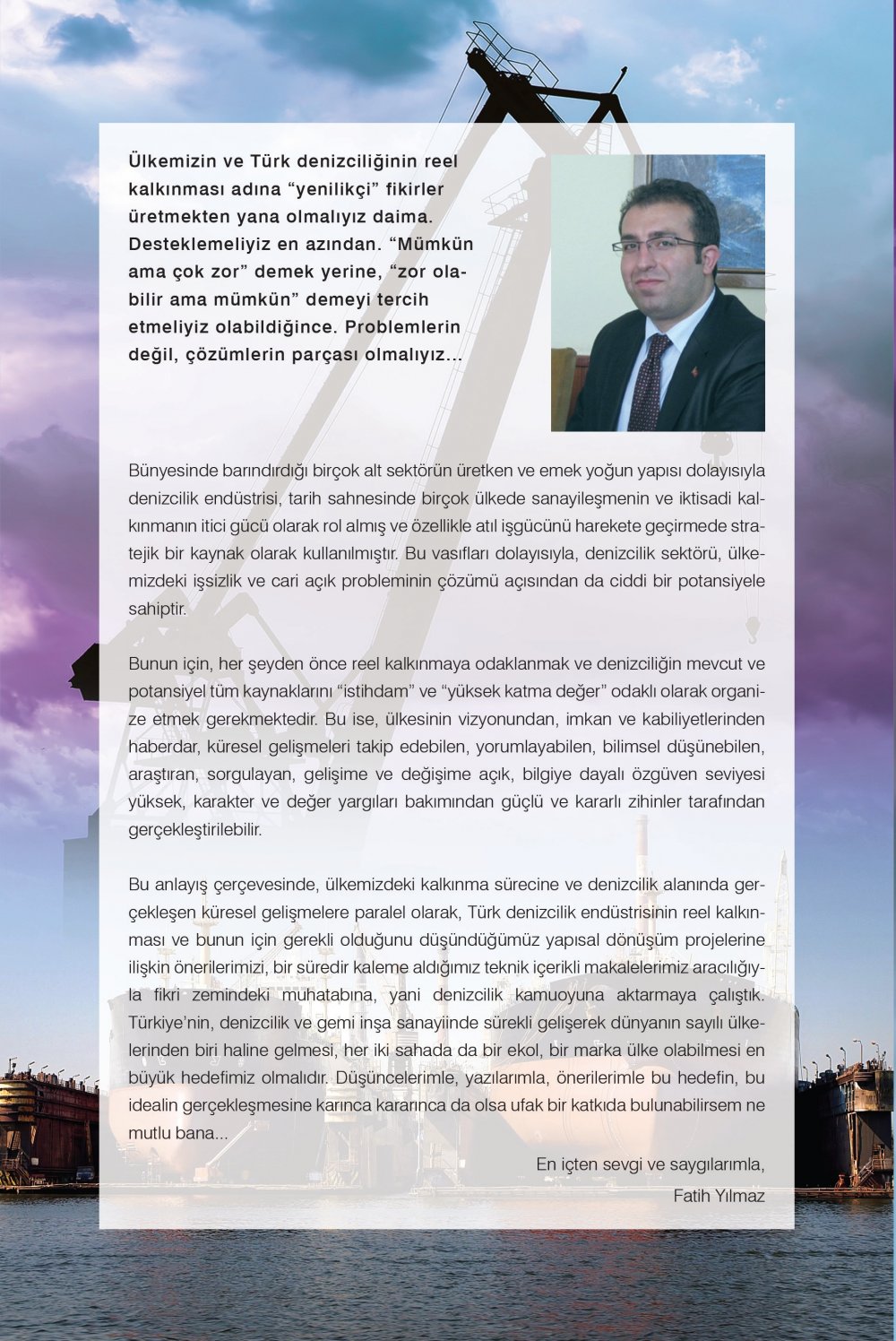 Gemi Mühendisi-Yazar Fatih Yılmaz'ın kitabında bahsettiği yapısal dönüşüm projelerinin ve önerilerin amacının; Türkiye'nin denizcilik ve gemi inşa sanayiinde sürekli gelişerek dünyanın sayılı ülkelerinden biri haline gelmesi, her iki sahada da bir ekol, bir marka ülke olabilmesine katkı sağlamak olduğu belirtiliyor.