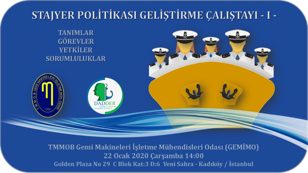 2019/2020 Öğretim yılı “Deniz Ulaştırma İşletme Mühendisliği” ve “Gemi Makineleri İşletme Mühendisliği” bölümü öğrencilerinin açık deniz stajlarına çıkmaya başladığı bu günlerde, GEMİMO ve Deniz Çalışanları Dayanışma Derneği (DADDER) ile birlikte staj politikaları ile ilgili seri çalıştaylar yapmayı planladık. Aşağıda detayları verilen çalıştaylardan ilki, “Tanımlar, Görevler, Yetkiler ve Sorumluluklar” başlıkları altında, gemi işletmelerinin personel ve eğitim müdürleri ile denizcilik eğitimi veren fakülte temsilcilerinin bir araya getirilmesi planlanmıştır.