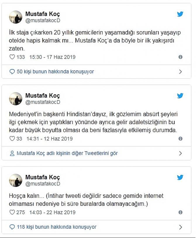 11 Temmuz sabaha karşı 4 civarı Cibuti Limanı’nda vardiyası olmasına rağmen, yorgunluğundan dolayı uyandırılamadığı iddia edilen Mustafa Koç’un, sonrasında sabah 8 civarında uyandırılmak için odasına girildiğinde öldüğü anlaşıldı.