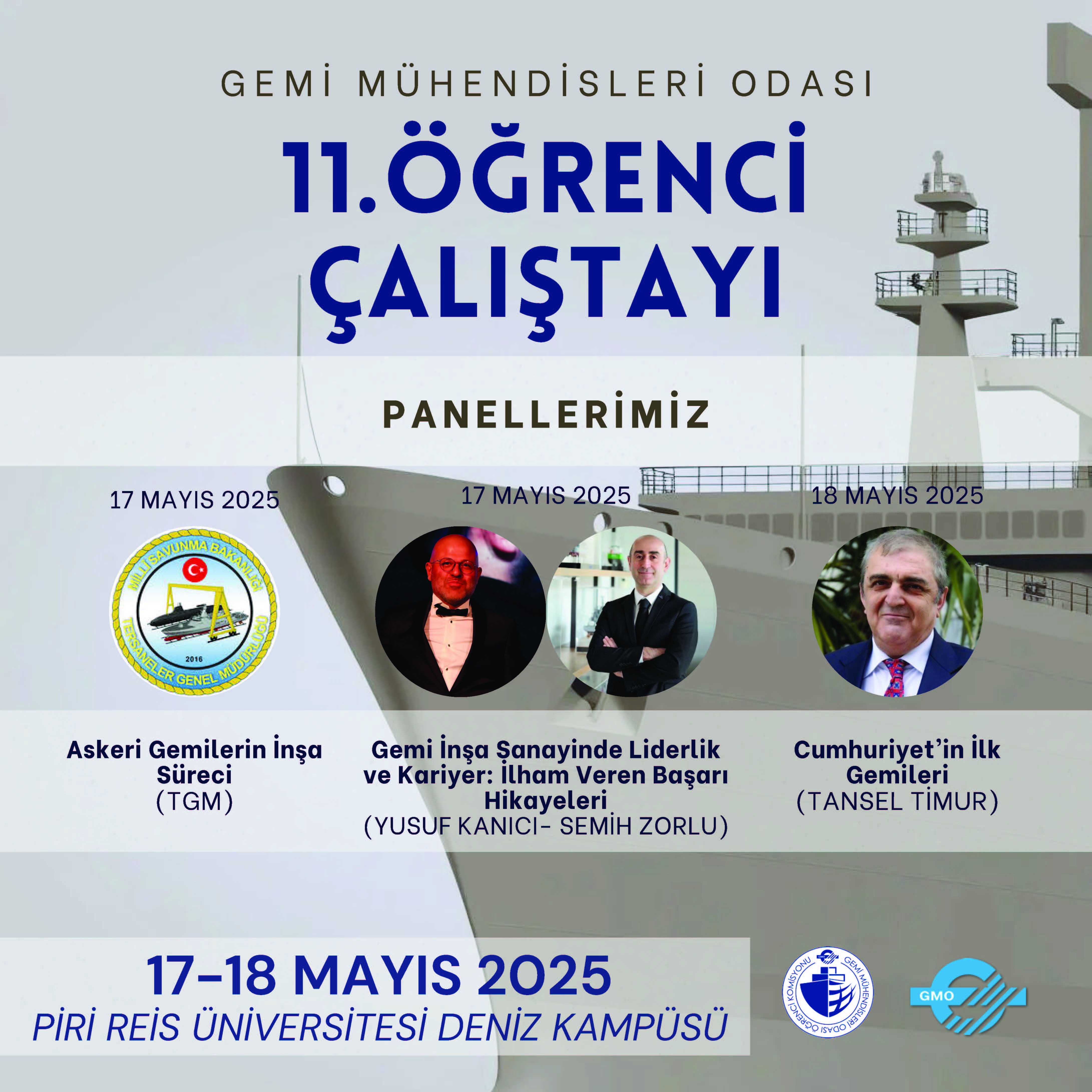 TMMOB Gemi Mühendisleri Odası Öğrenci Komisyonu tarafından düzenlenen 11. Öğrenci Çalıştayı, bu yıl 17-18 Mayıs 2025 tarihlerinde Piri Reis Üniversitesi Deniz Kampüsünde gerçekleştirilecektir.