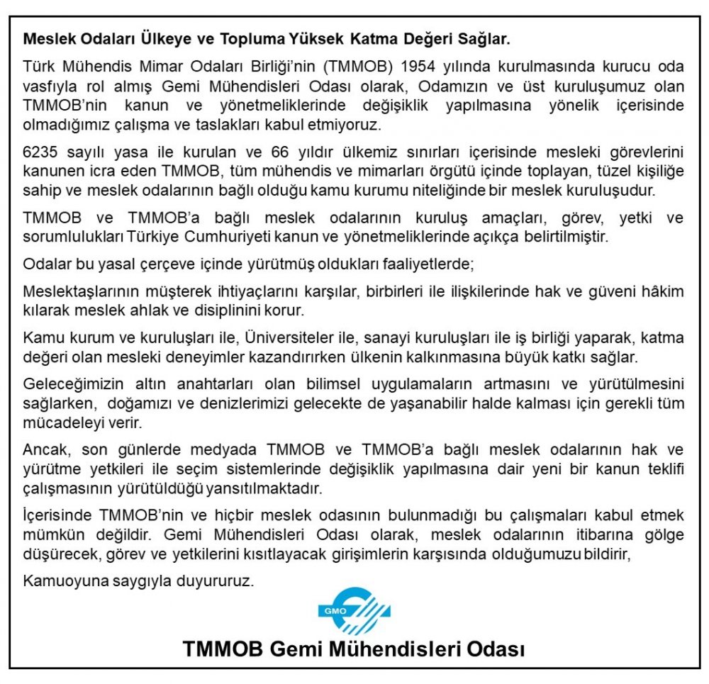 Gemi Mühendisleri Odası, TMMOB ve TMMOB’a bağlı meslek odaları hakkındaki kamuoyu duyurusu: