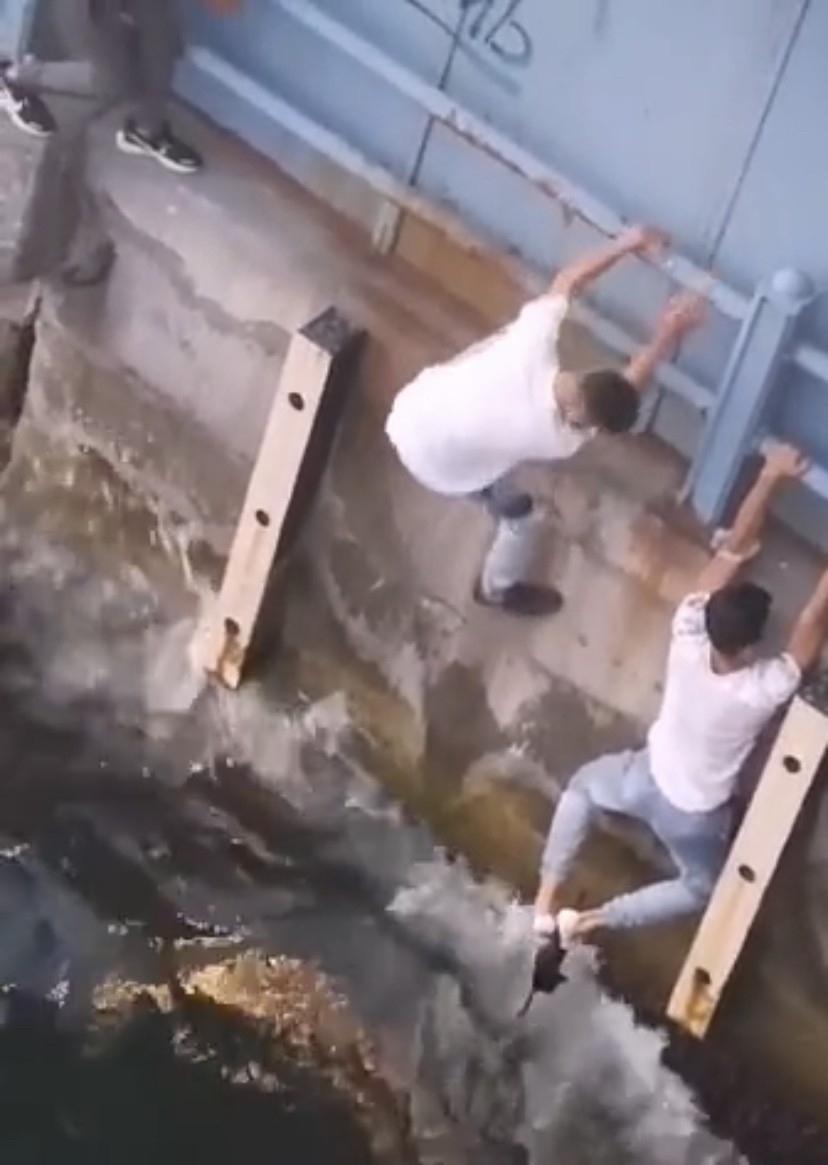 Yavru kedinin dalgalar arasında çırpındığını görenler, kediyi kurtarmak istedi. İki kişi, köprü üzerindeki demir korkuluklardan kendilerini sarkıttılar. Bir kişi denizdeki yavru kediyi ayaklarıyla sıkıştırarak denizden çıkardı. Diğer kişi ise eliyle kediyi alarak köprünün üzerine bıraktı.