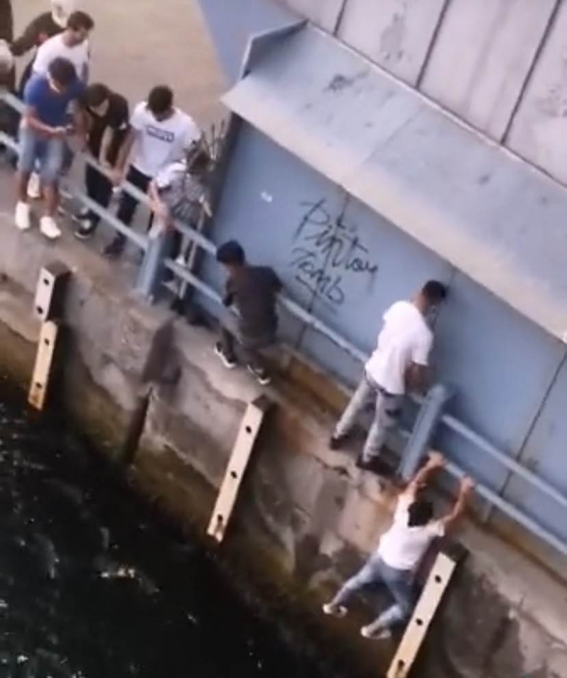 Haliç'te denize düşen yavru kedi, Galata Köprüsü'ndeki vatandaşlar tarafından kurtarıldı. 2 kişinin, demir korkuluklardan kendisini sarkıtarak, ayaklarıyla yavru kediyi kurtardığı anlar, cep telefonu kamerasına saniye saniye yansıdı.