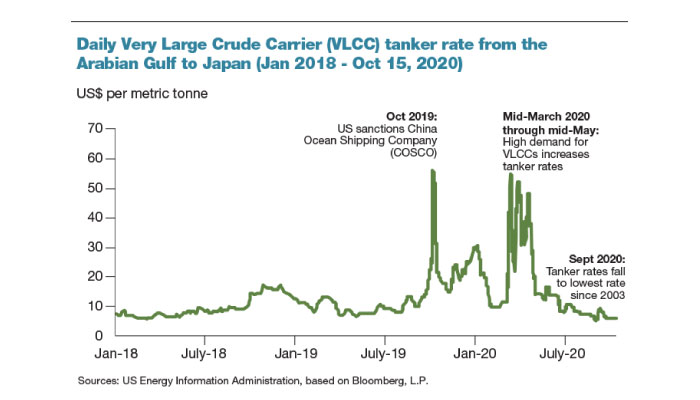 EIA, ABD'nin Çinli nakliye firması China Ocean Shipping Company'ye (COSCO) uyguladığı yaptırımların bir sonucu olarak Ekim 2019'da tanker oranlarındaki kısa bir artış dışında, Mart 2020 ortasındaki fiyatın 2000'den beri en yüksek fiyat olduğunun da altın çizdi.
