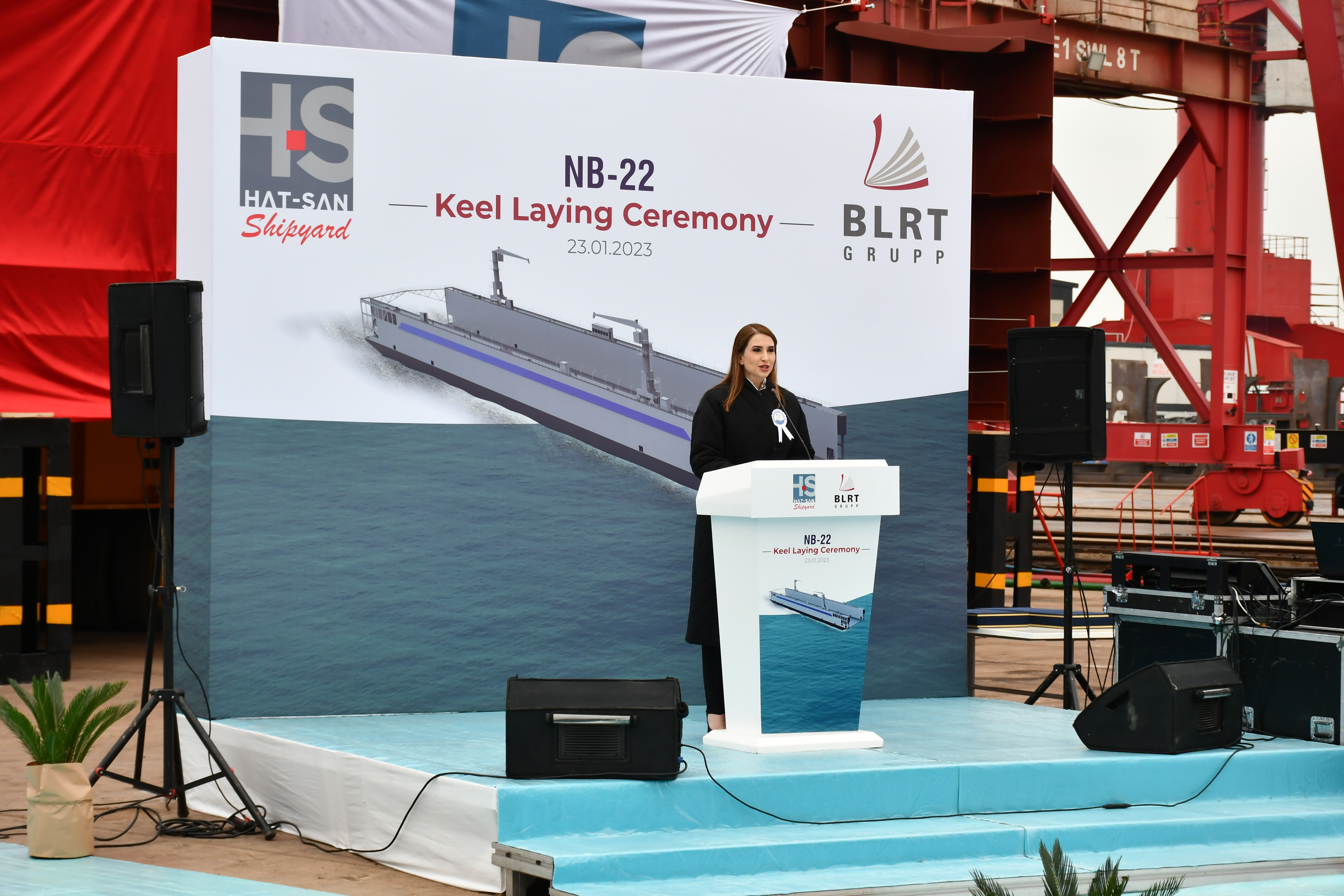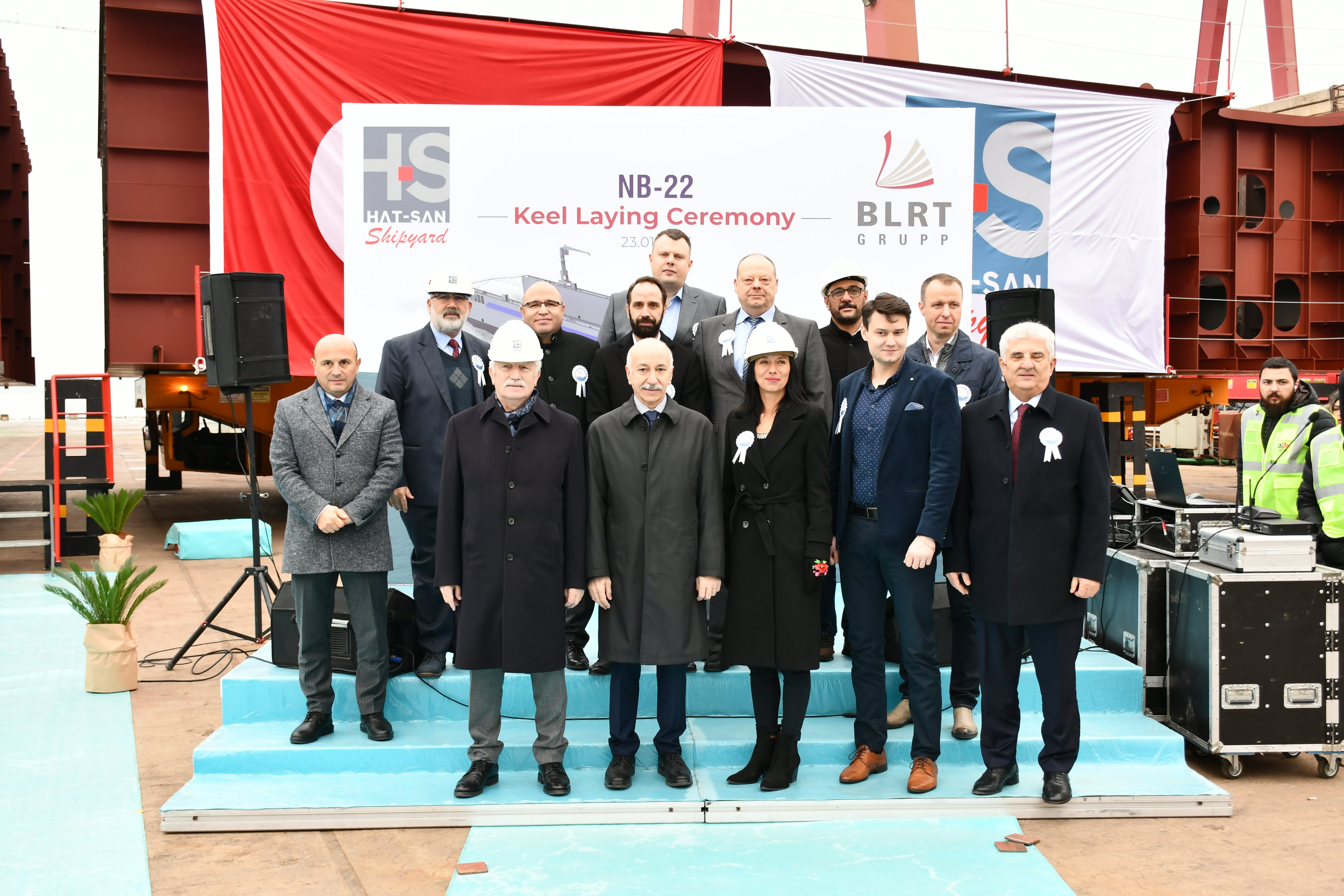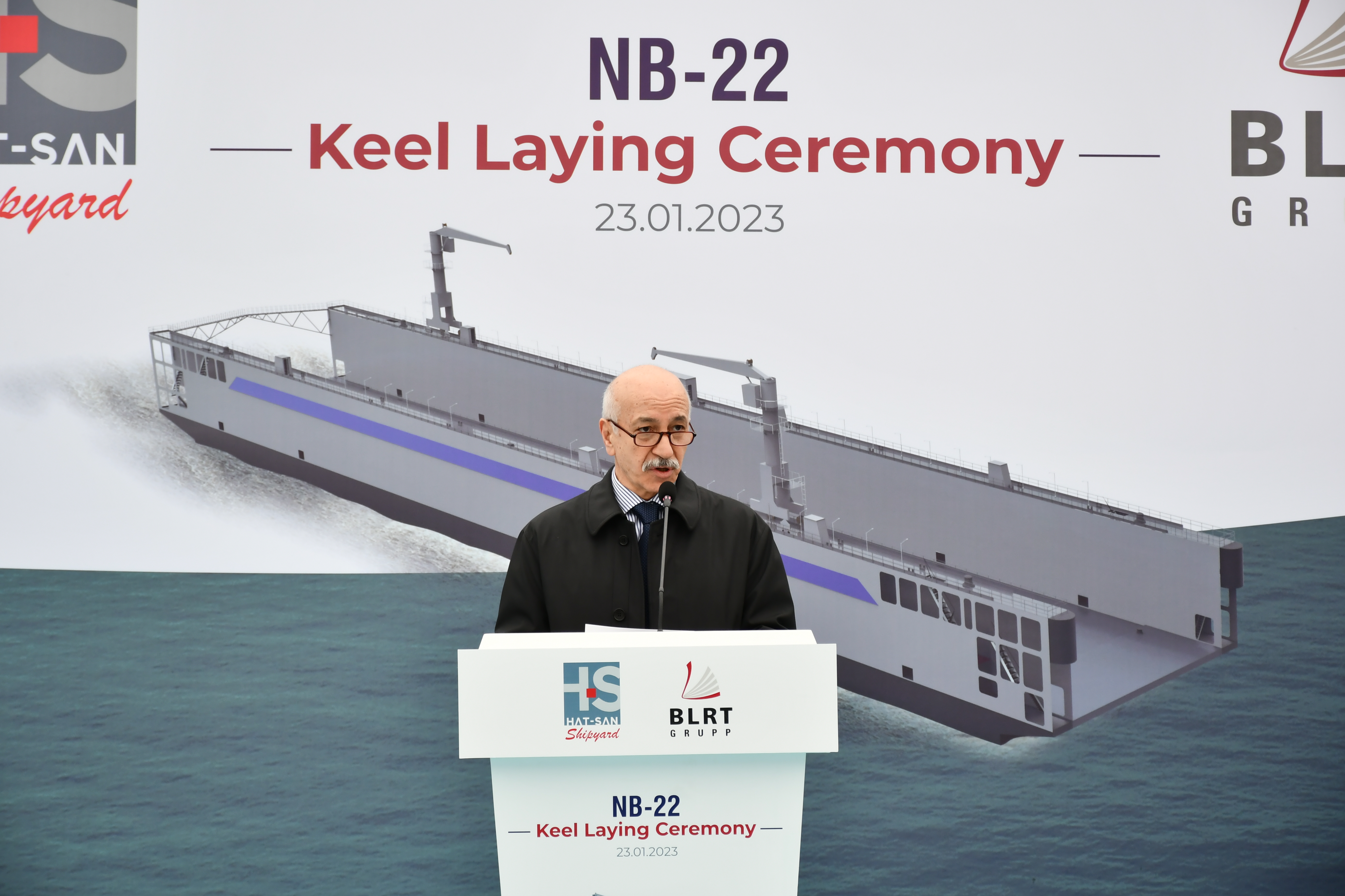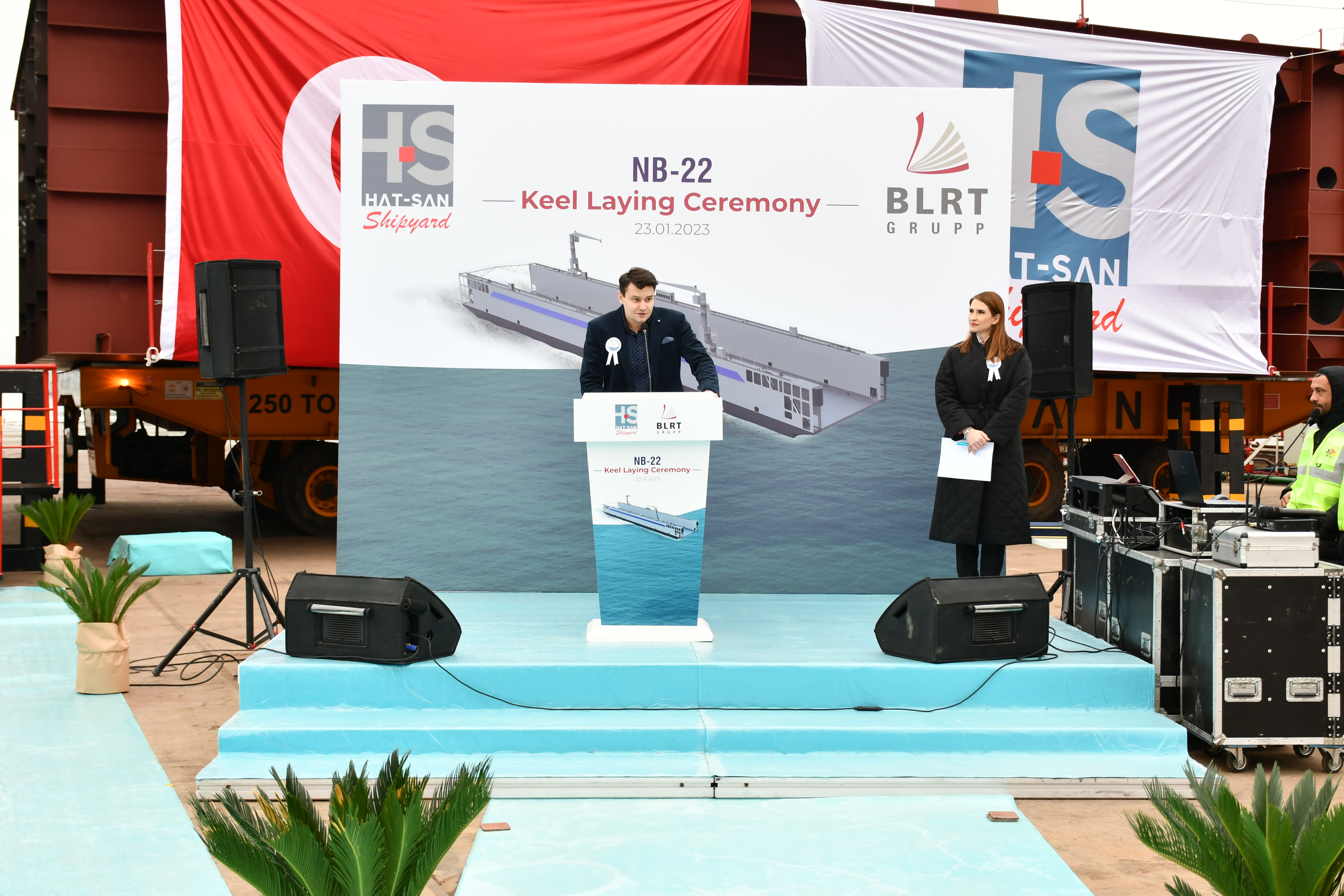 Hat-San Yönetim Kurulu Mustafa Pepe’nin konuşmasının ardından Estonya’nın Türkiye Büyükelçisi Annely Kolk ve Ulaştırma ve Altyapı Bakanlığı Bakan Yardımcısı Selim Dursun da törende günün önemine dair konuşma yaptı. Protokol konuşmalarından sonra NB 22’nin ilk omurga kaynağı yapıldı.