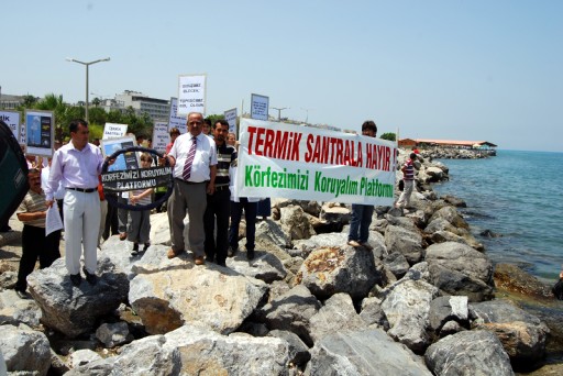 HATAY'IN ISKENDERUN ILCESINDE BAZI SIVIL TOPLUM KURULUSLARI TARAFINDAN KURULAN ''KORFEZIMIZI KORUYALIM PLATFORMU'' UYELERI, SARISEKI BELDESINE KURULMASI PLANLANAN TERMIK SANTRALE TEPKI AMACIYLA DENIZE SIYAH CELENK BIRAKTI. (AA)