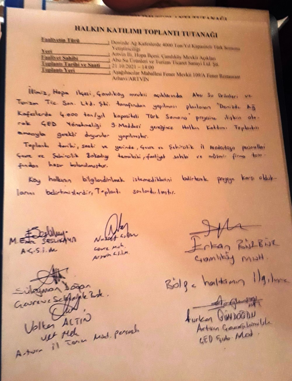 Toplantıyı protesto eden vatandaşlar ve balıkçılar, ısrarla toplantının yapılmadığının tutanak altına alınması ısrarı sonrası toplantıya katılan Artvin Tarım İl Müdürlüğü yetkilileri de tutanak tutarak toplantının yapılamadığını tutanak altına alması ardından toplantı da sona erdi.
