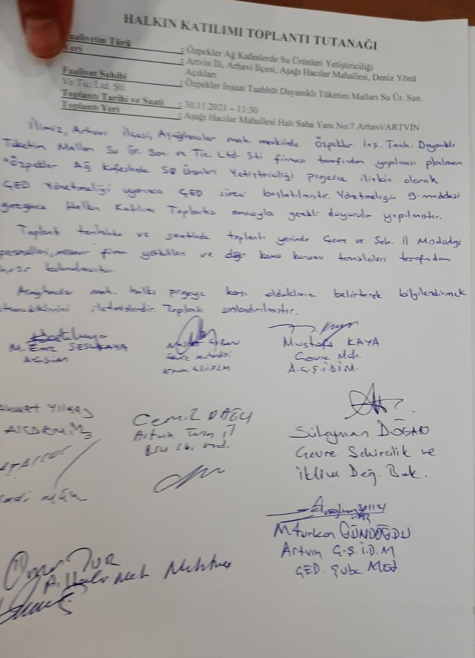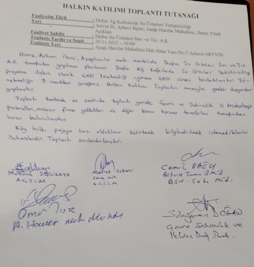 Bu denli büyük bir alanda yapılması amaçlanan kafes balıkçılığı Projesi’ne ilişkin toplantı Arhavi Hacılar Mahallesi ve Hopa Çamlı köy sakinleri ile yöre balıkçılarının yoğun tepkisi ile hayata geçirilmemiştir.