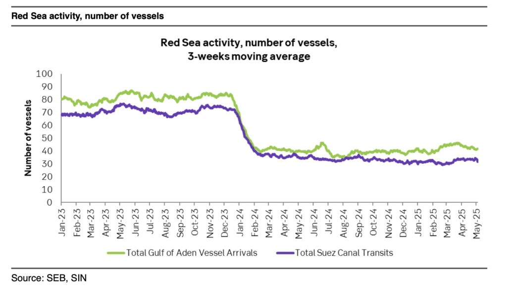 İsveçli banka SEB'nin verilerine göre Kızıldeniz'deki taşımacılık hacmi hâlâ baskı altında; 2023 seviyelerine kıyasla yaklaşık %50 daha düşük.