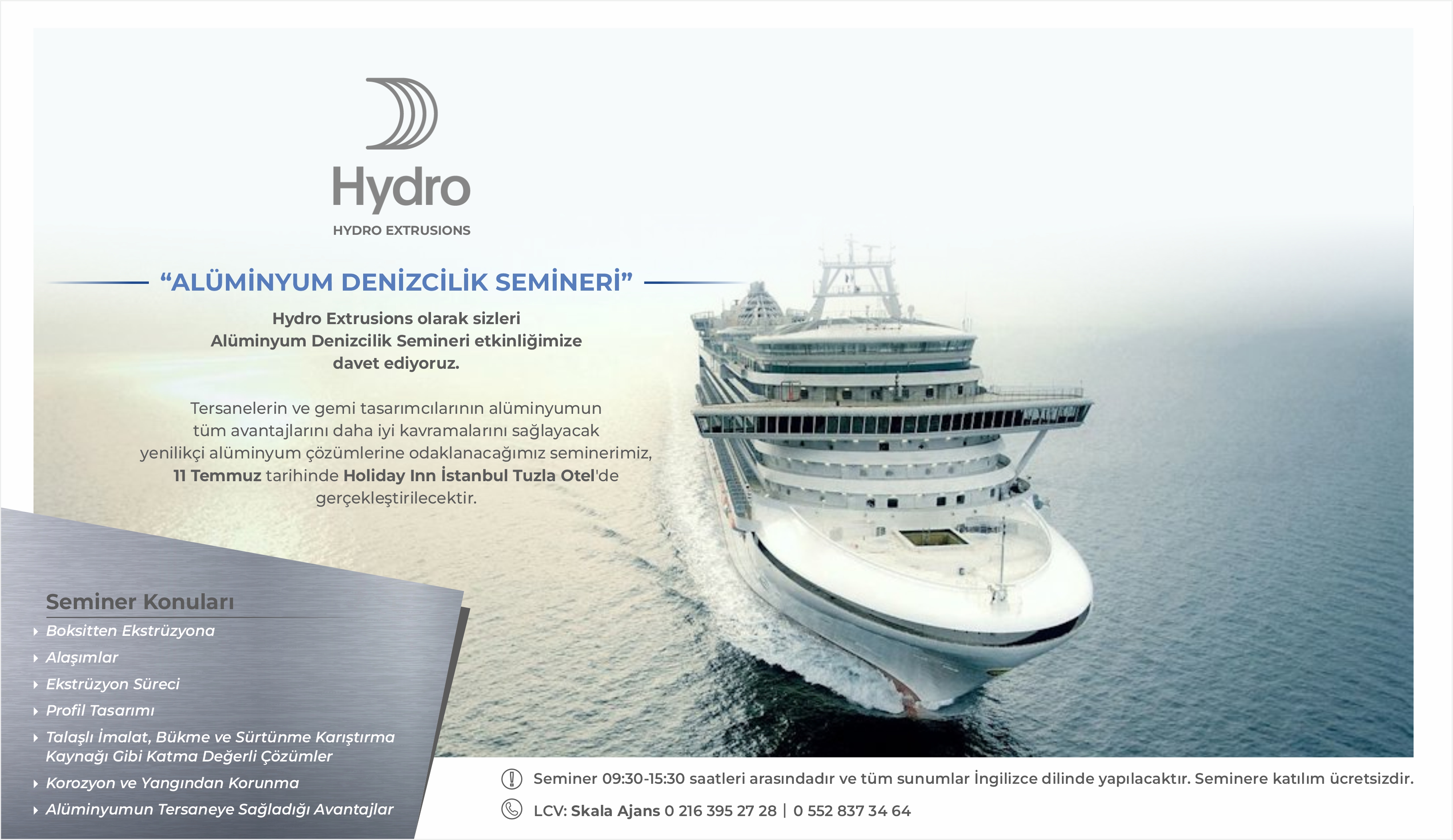 Hafif alüminyumda dünyanın önde gelen katma değerli ekstrüzyon üreticisi Hydro Extrusions, 11-13 Temmuz tarihlerinde İstanbul ve Antalya’da ‘’Alüminyum Denizcilik Seminerleri’’ düzenleyecek.